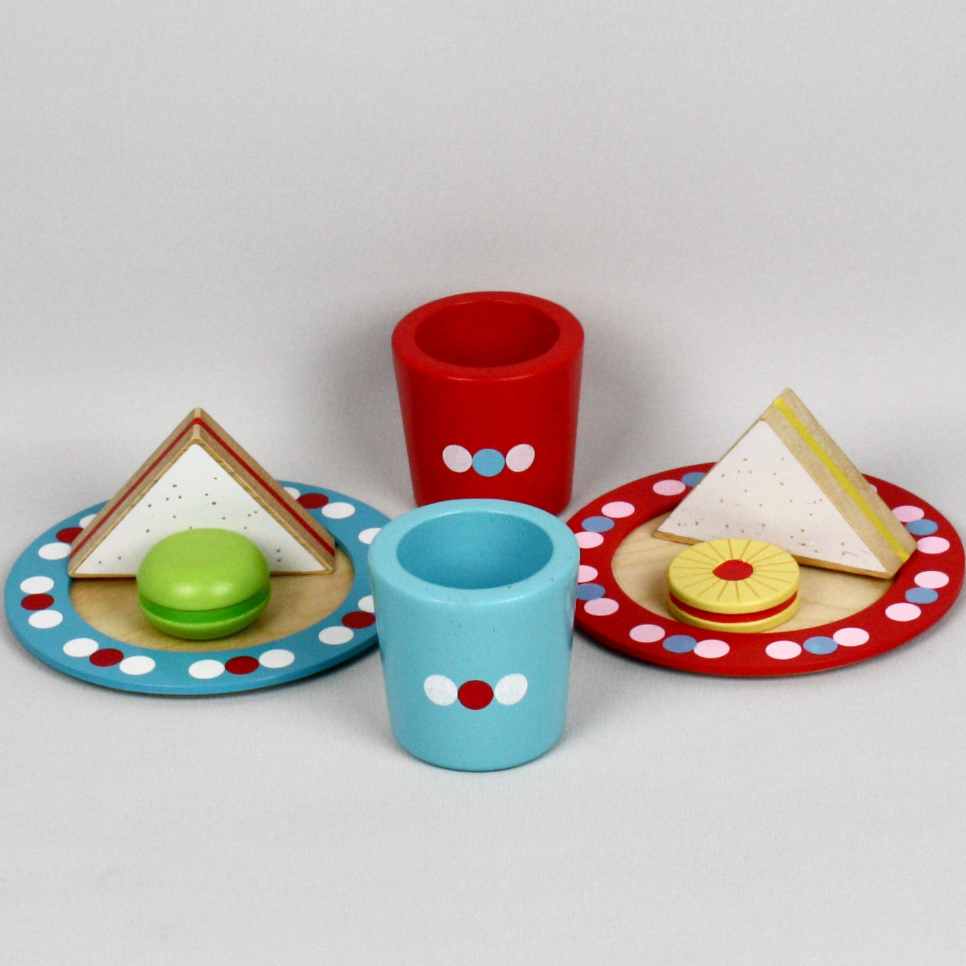 - 2x wooden plates, 2x wooden cups, 2x wooden sandwiches, 2x wooden sweet treats