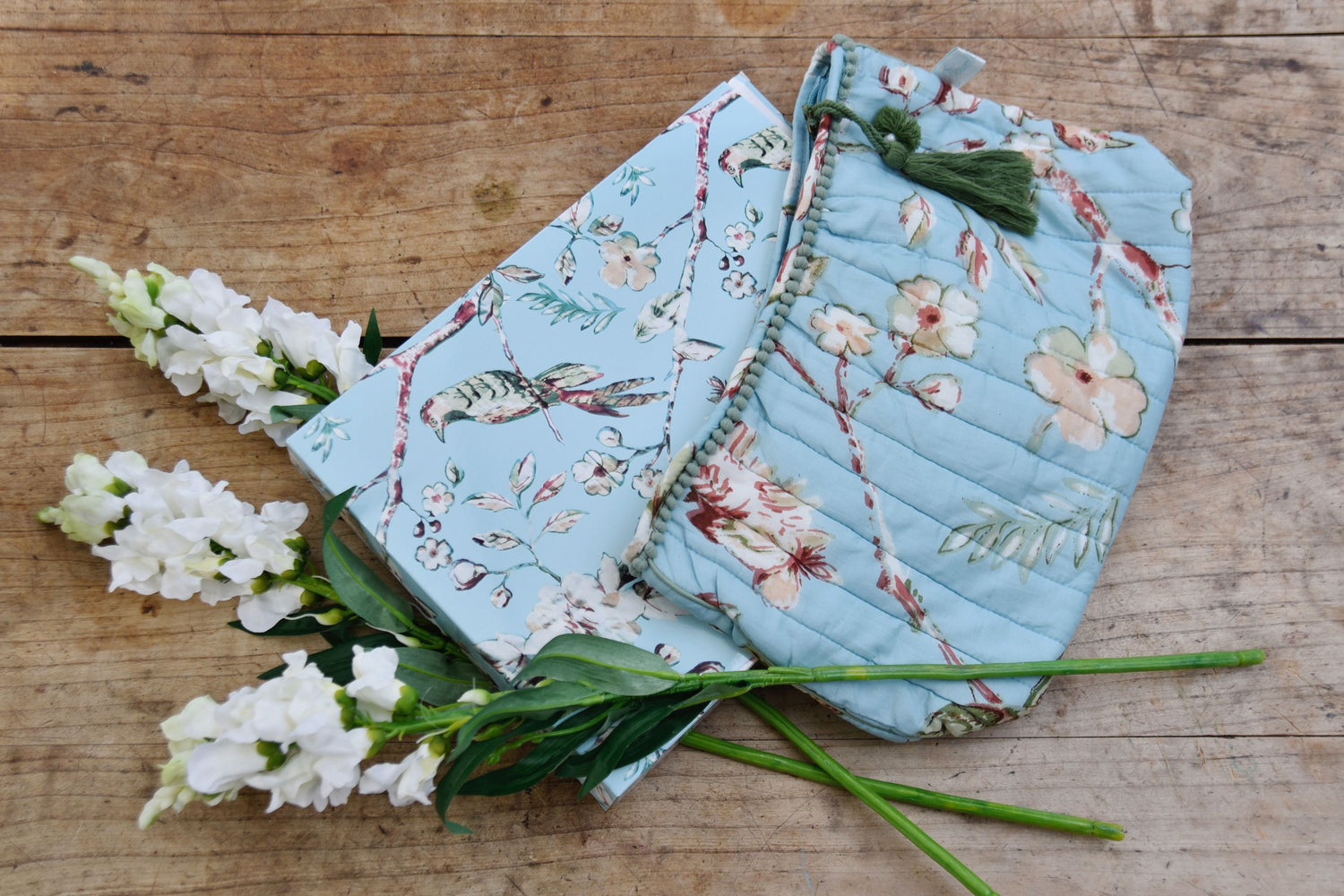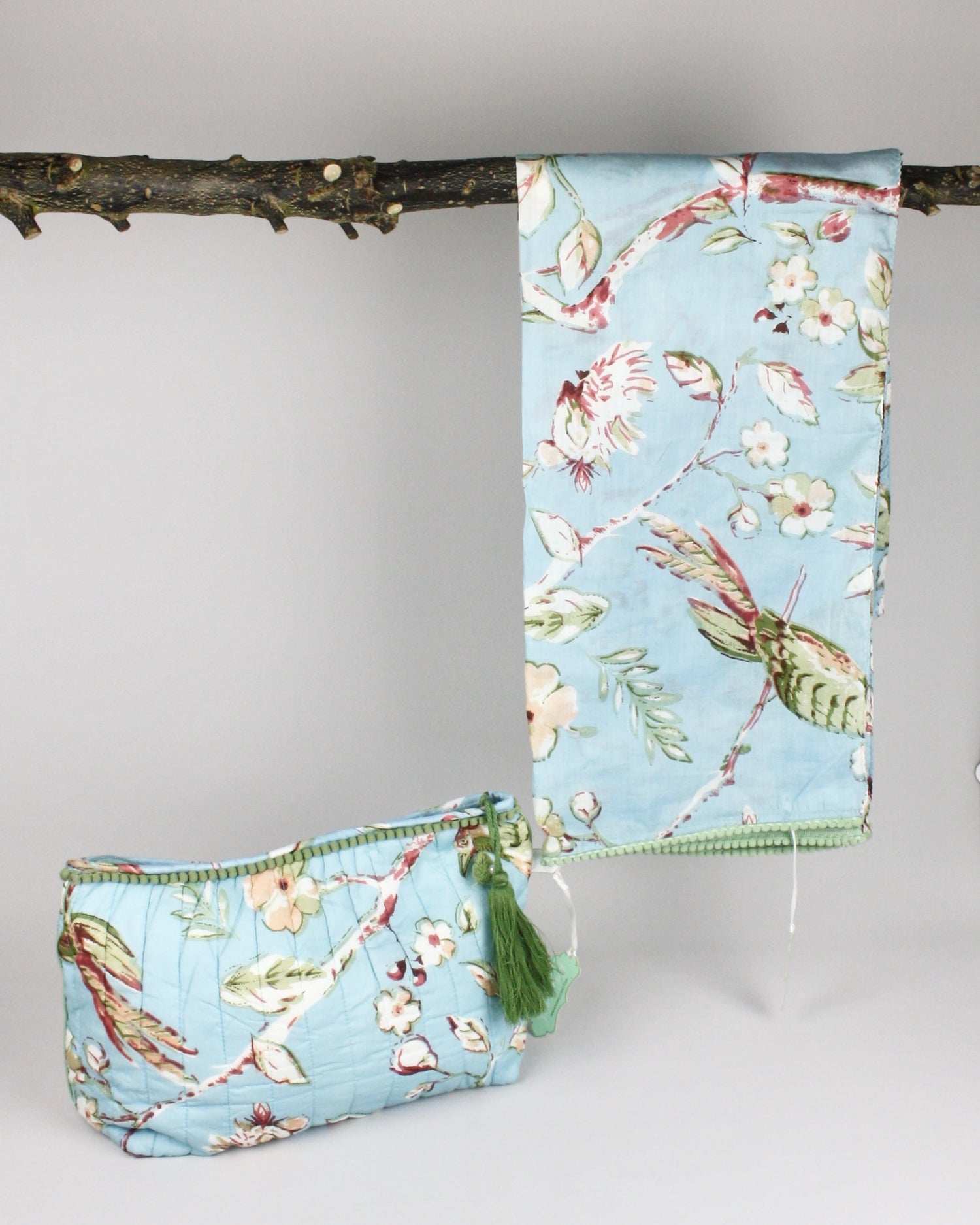 This generously sized bag has a silky lining, a zipped internal pocket, and decorative piping. The zip pulls with a pom-pom and pearl trimmed tassel and there is a soft green pom-pom trim along the top. Our blue blossom pattern is a customer favourite and features birds with soft green plumes sitting on branches budding into cream blooms against a pale blue background. Such a pretty addition to your bathroom or perfect to store your essentials for trips away.