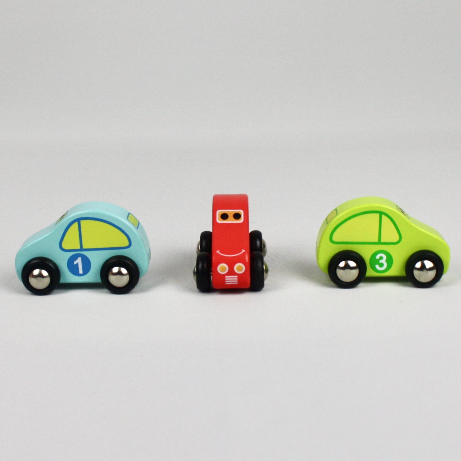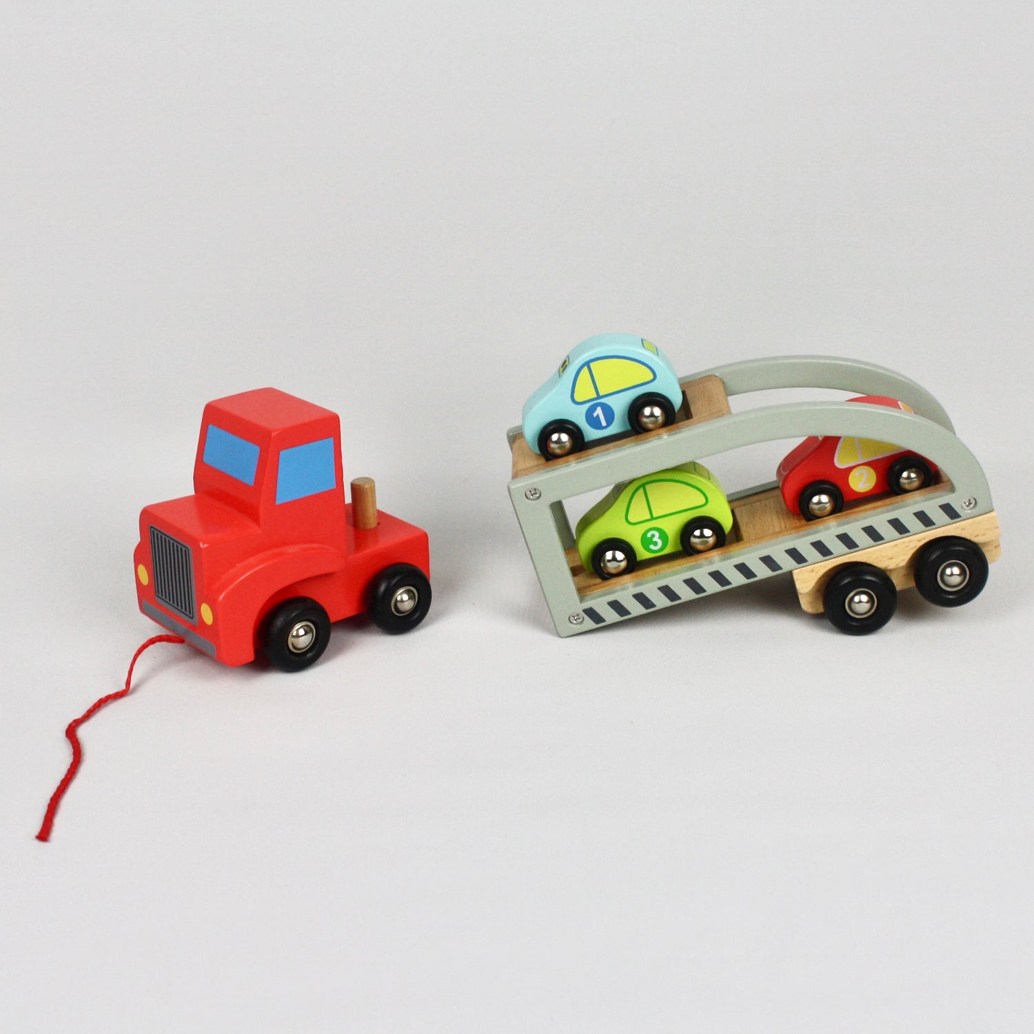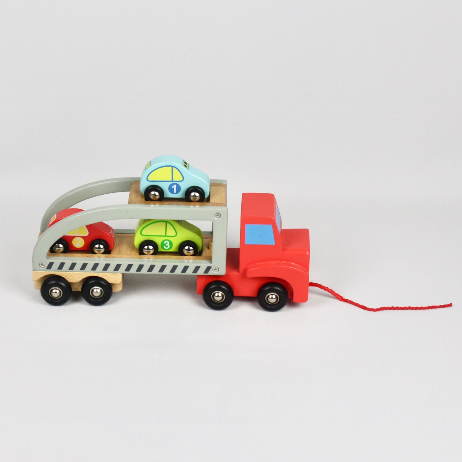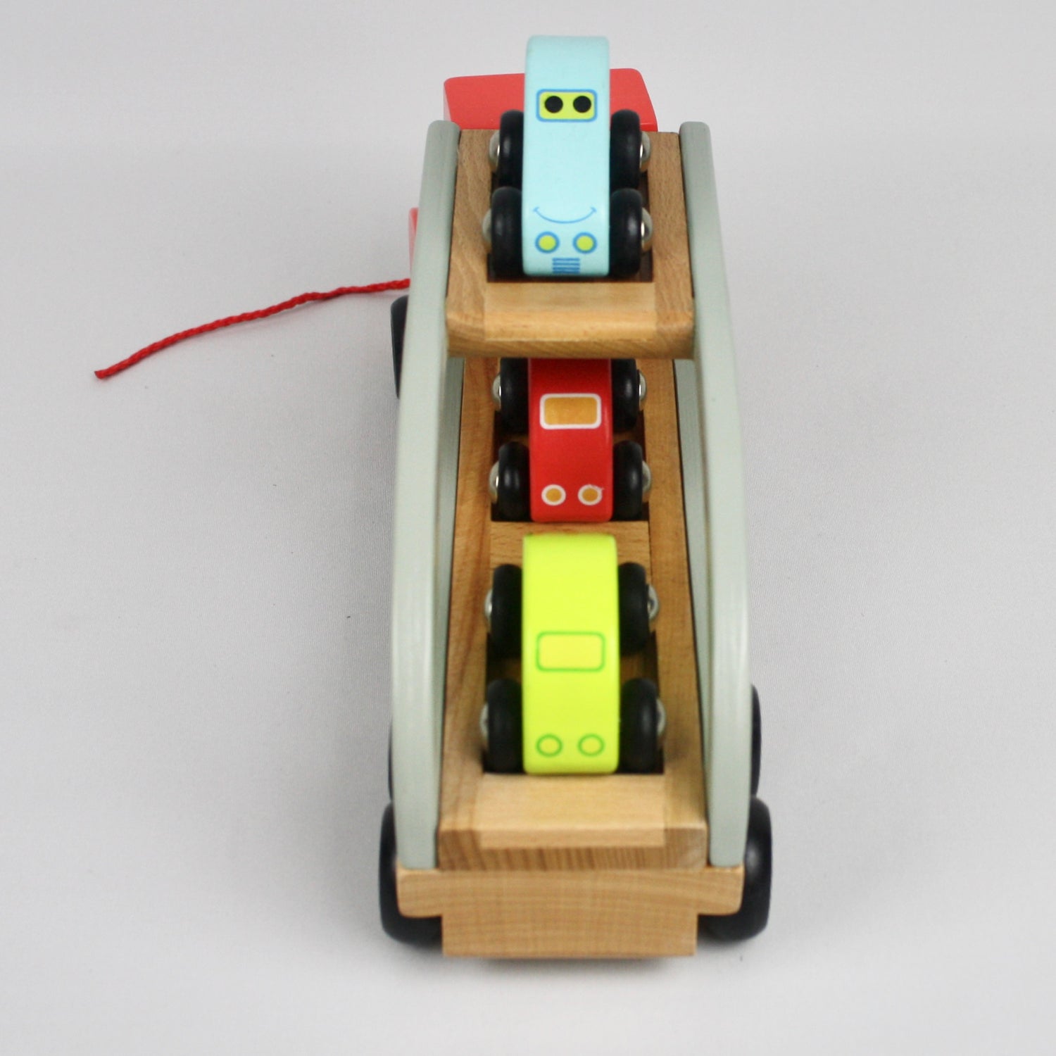 Made from natural wood, this transporter has two tiers which fits the 3 cars snugly on the back. Painted in bright colours the car carrier and cars all have super smooth rolling wheels ready to travel a long way!