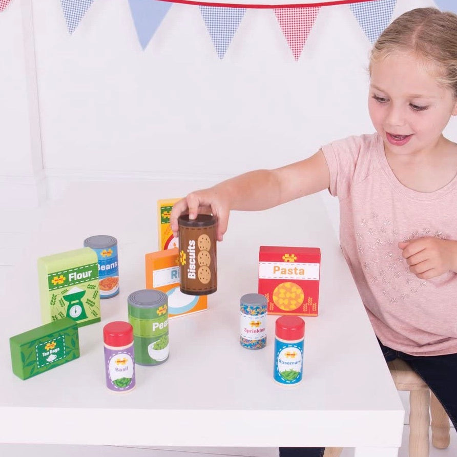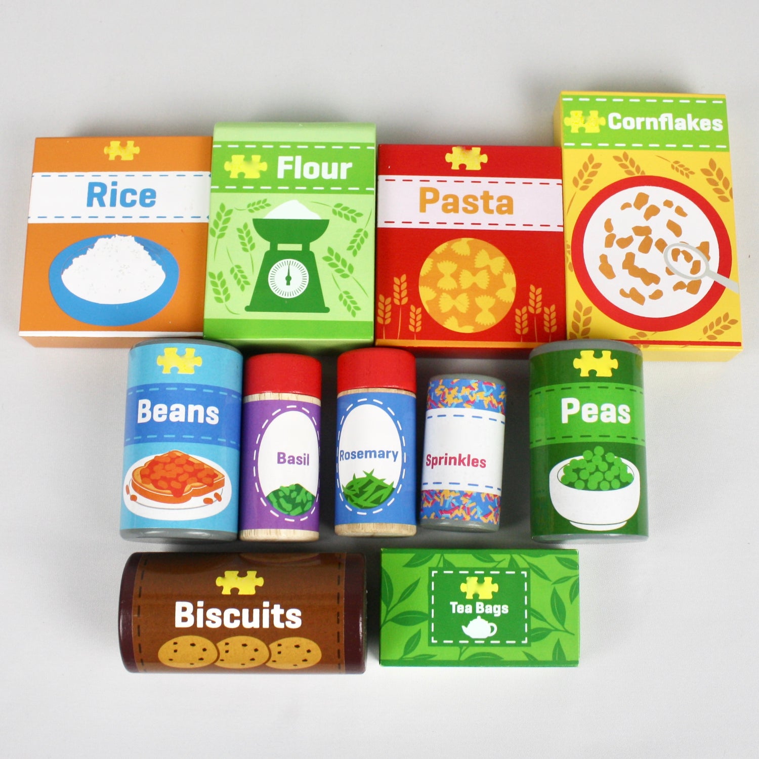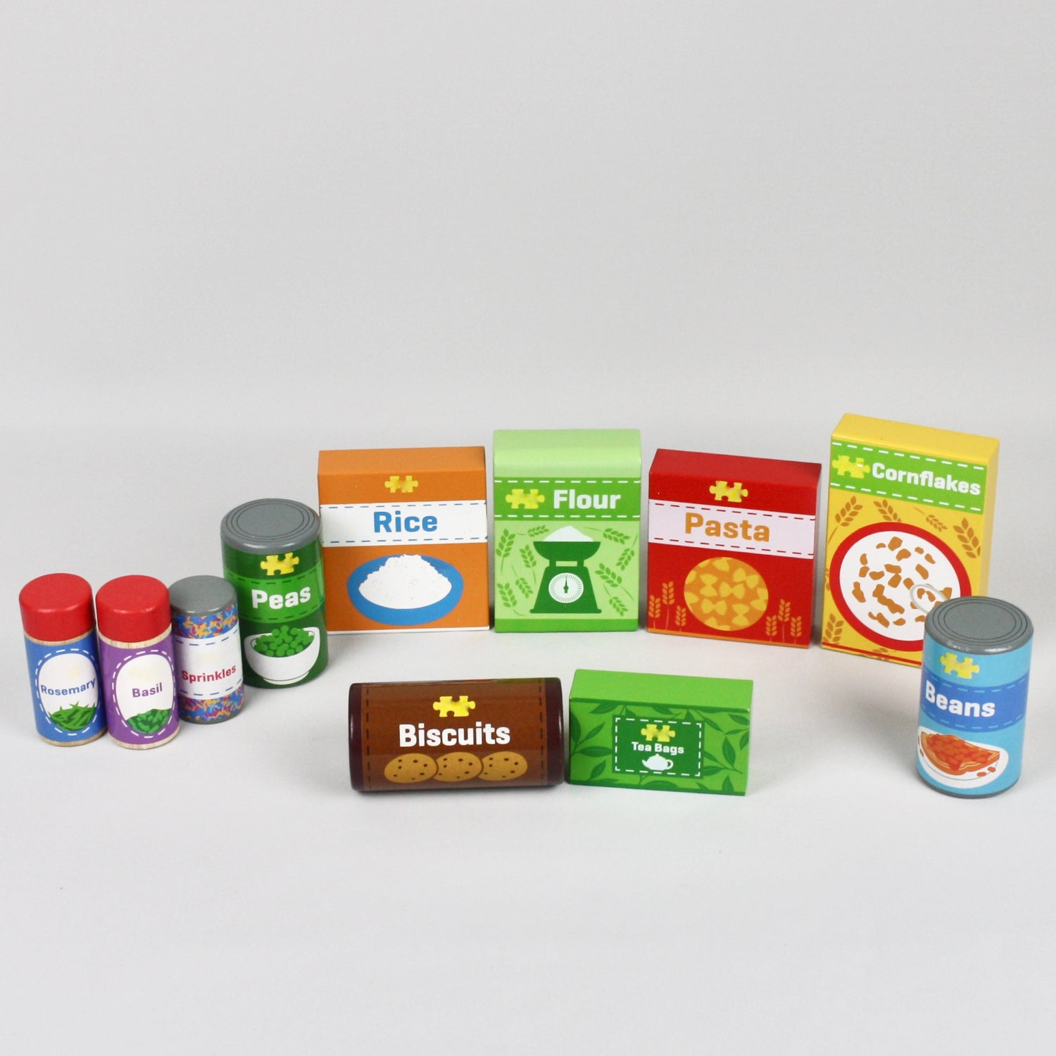 Wooden groceries include: biscuits, tea bags, beans, pasta, cornflakes, rice & more!