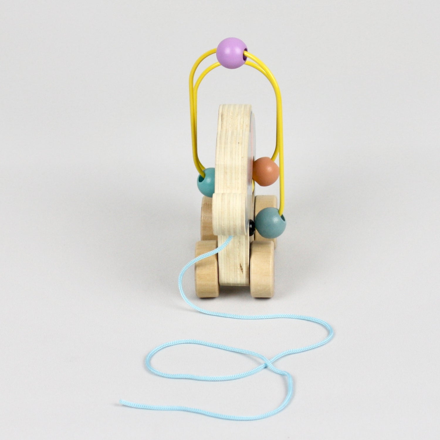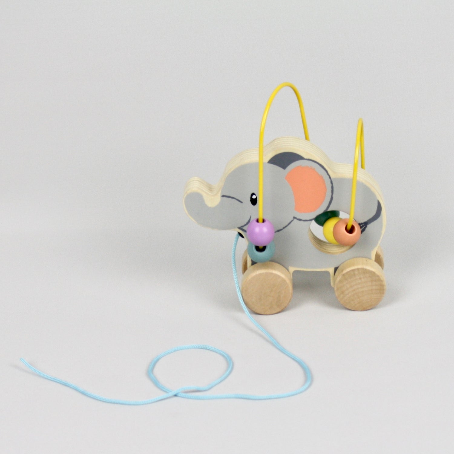 A beautifully designed elephant bead maze with pull along string and rolling feet.