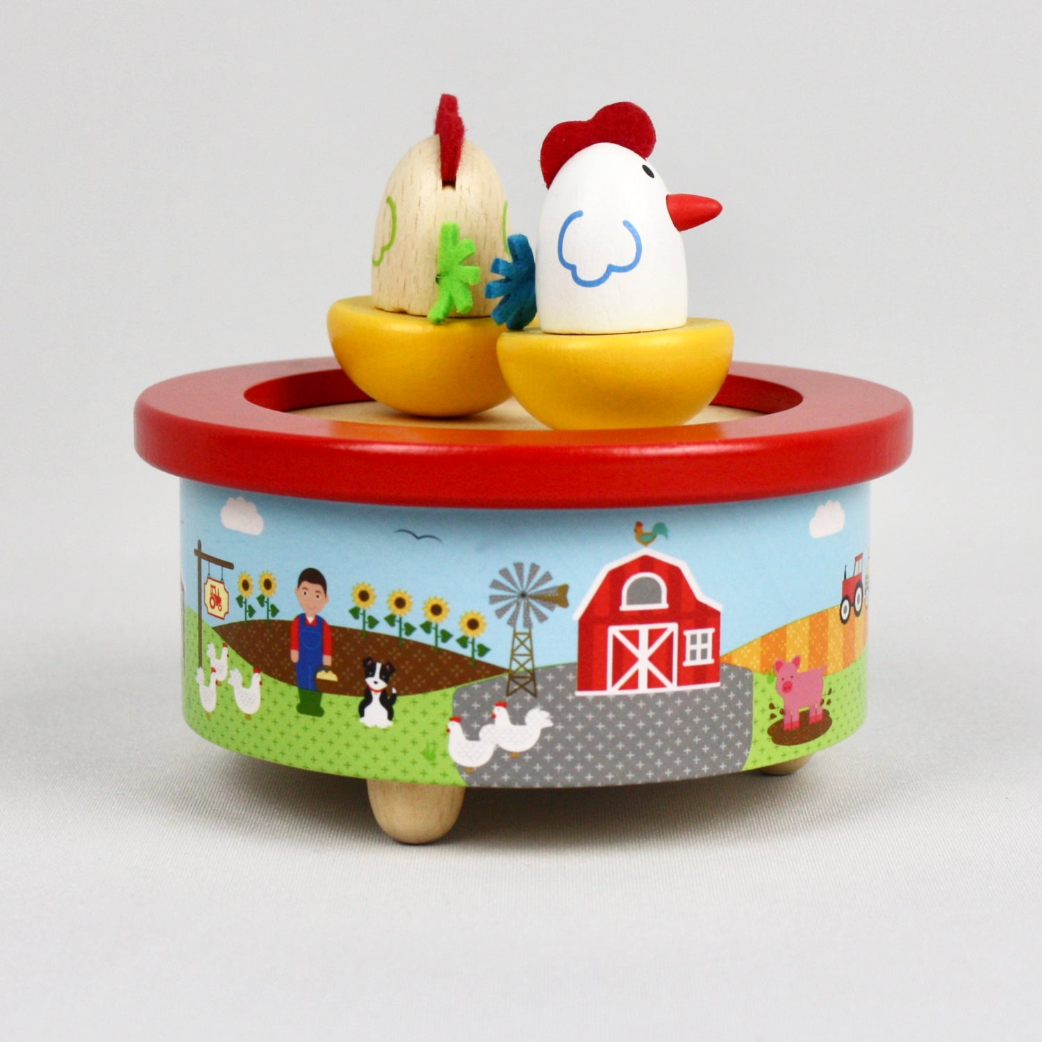 Just wind up the music box, and enjoy watching the cheeky chickens dance and twirl along to the tune of "Old Macdonald". The chickens are attached to the base via hidden magnets but can be easily removed for playing with on a table or on the floor.