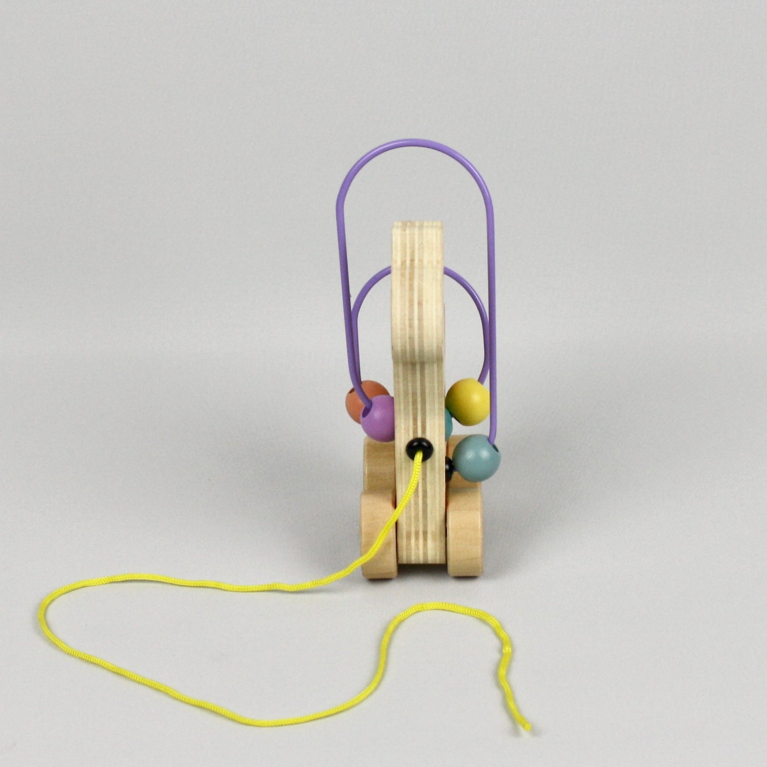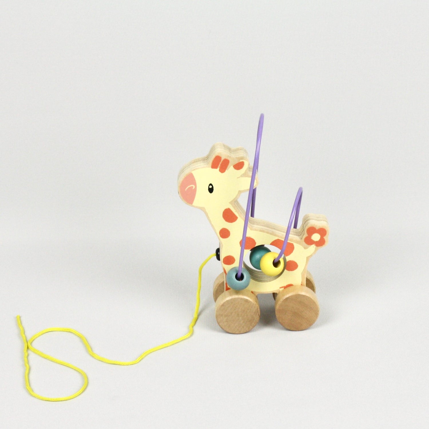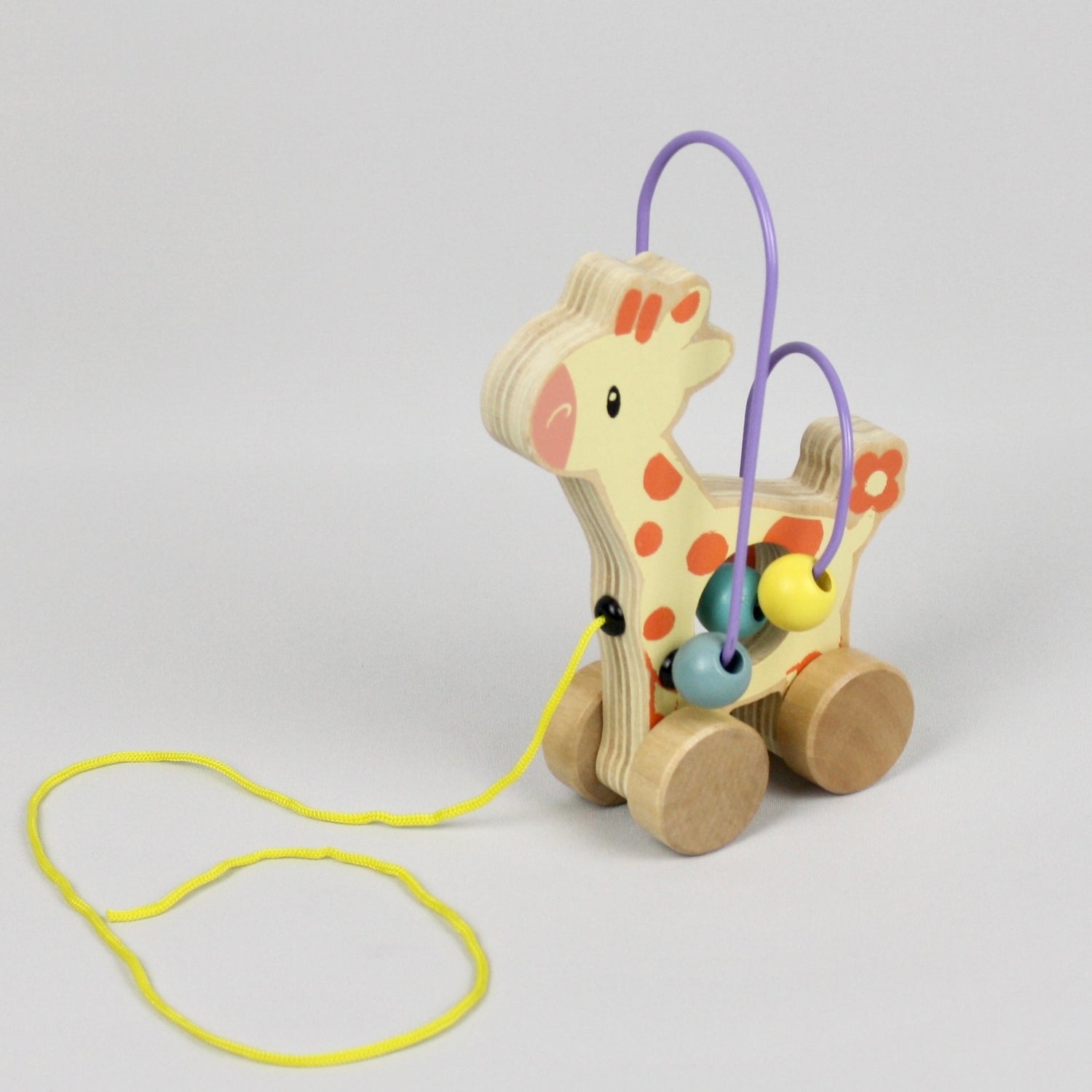 A beautifully designed giraffe bead maze with pull along string and rolling feet.