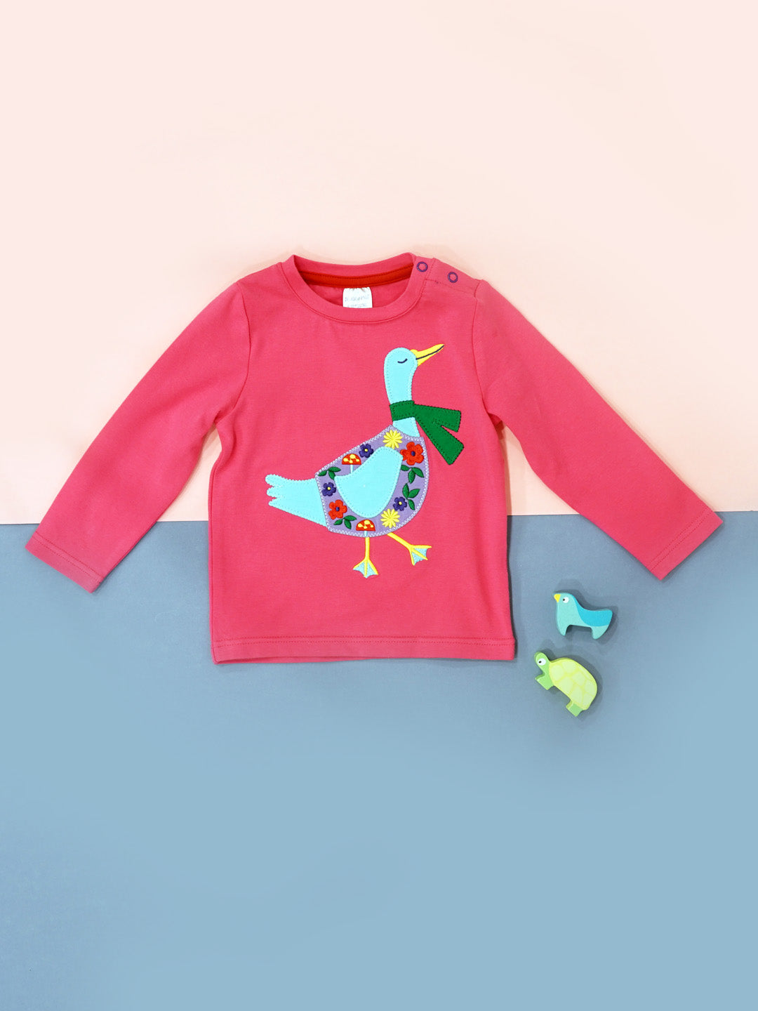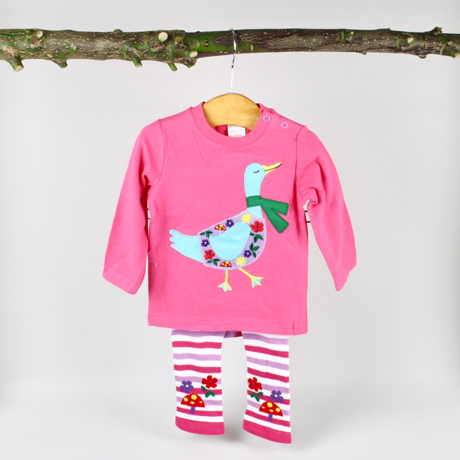 We adore this gorgeous goose inspired top and leggings. The top is hot pink and features a soft fleece applique goose who is ready to explore. The leggings are in lilac, pink and white stripes, featuring an aqua blue goose on the bum, who is ready to wander and explore.