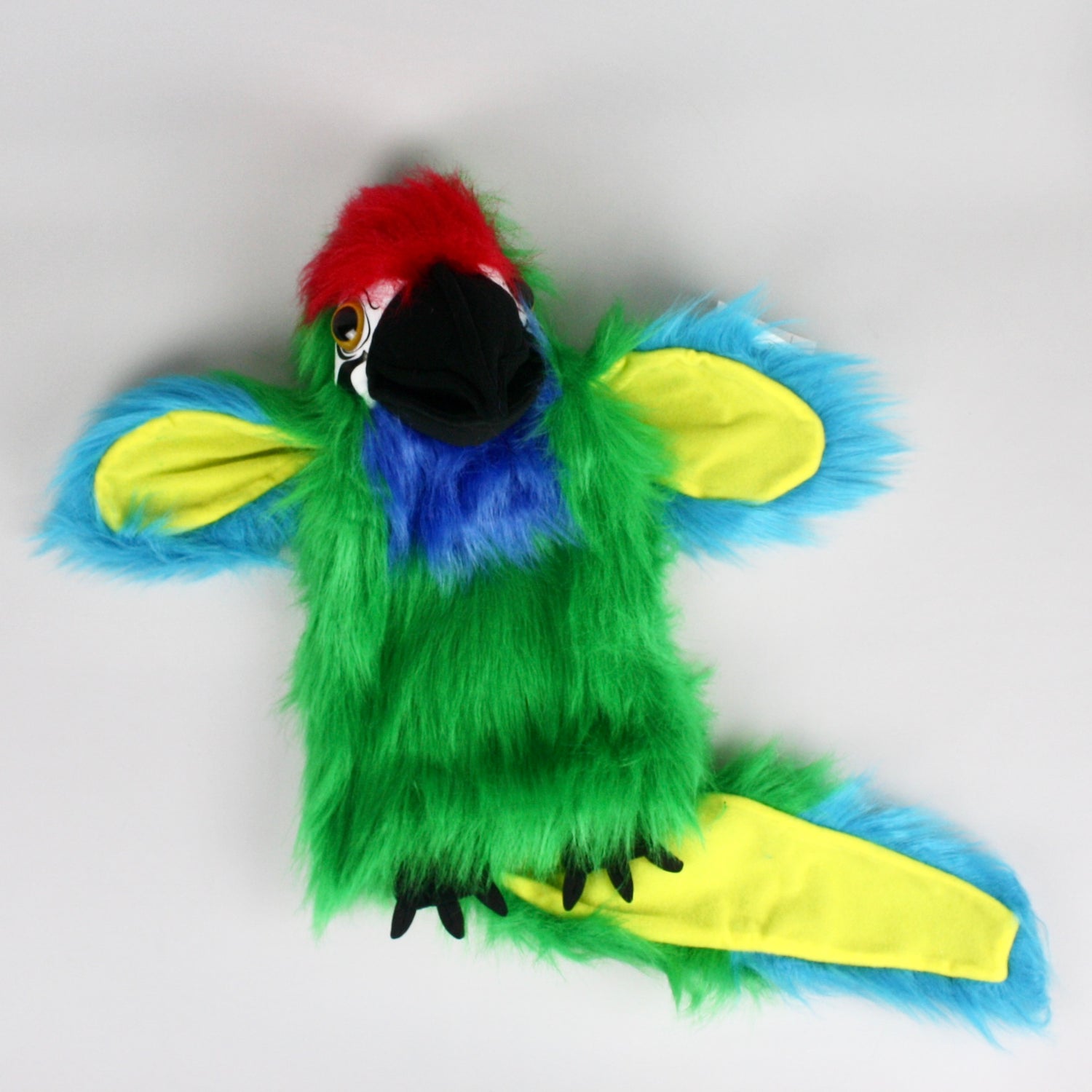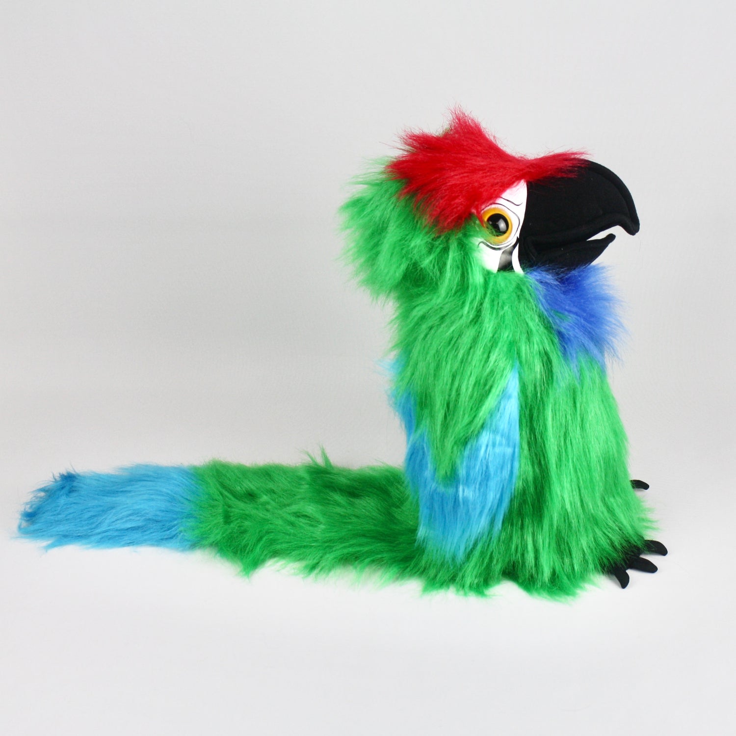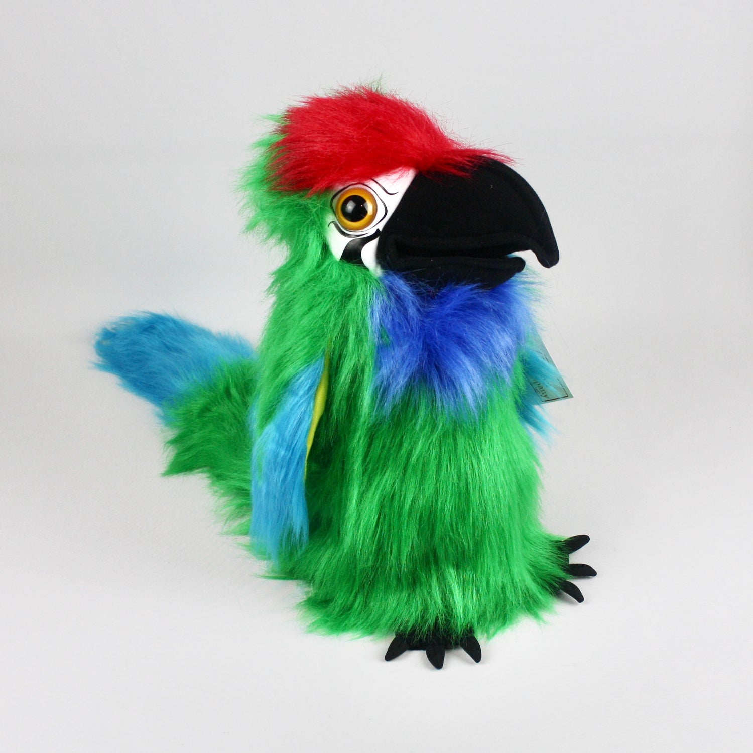 It has an accurately detailed face, a huge beak, vibrant tropical colours and a loud squawk with great mouth movement. Its body, tail and wings are soft to the touch and covered in long, colourful pile. It also has small black feet and easy access at base into the head