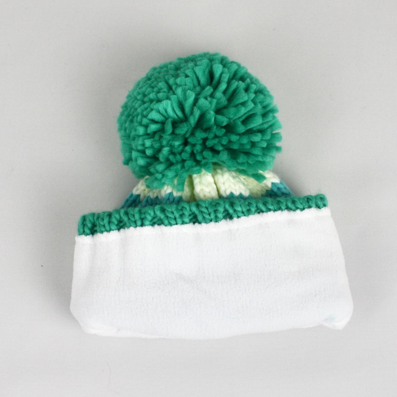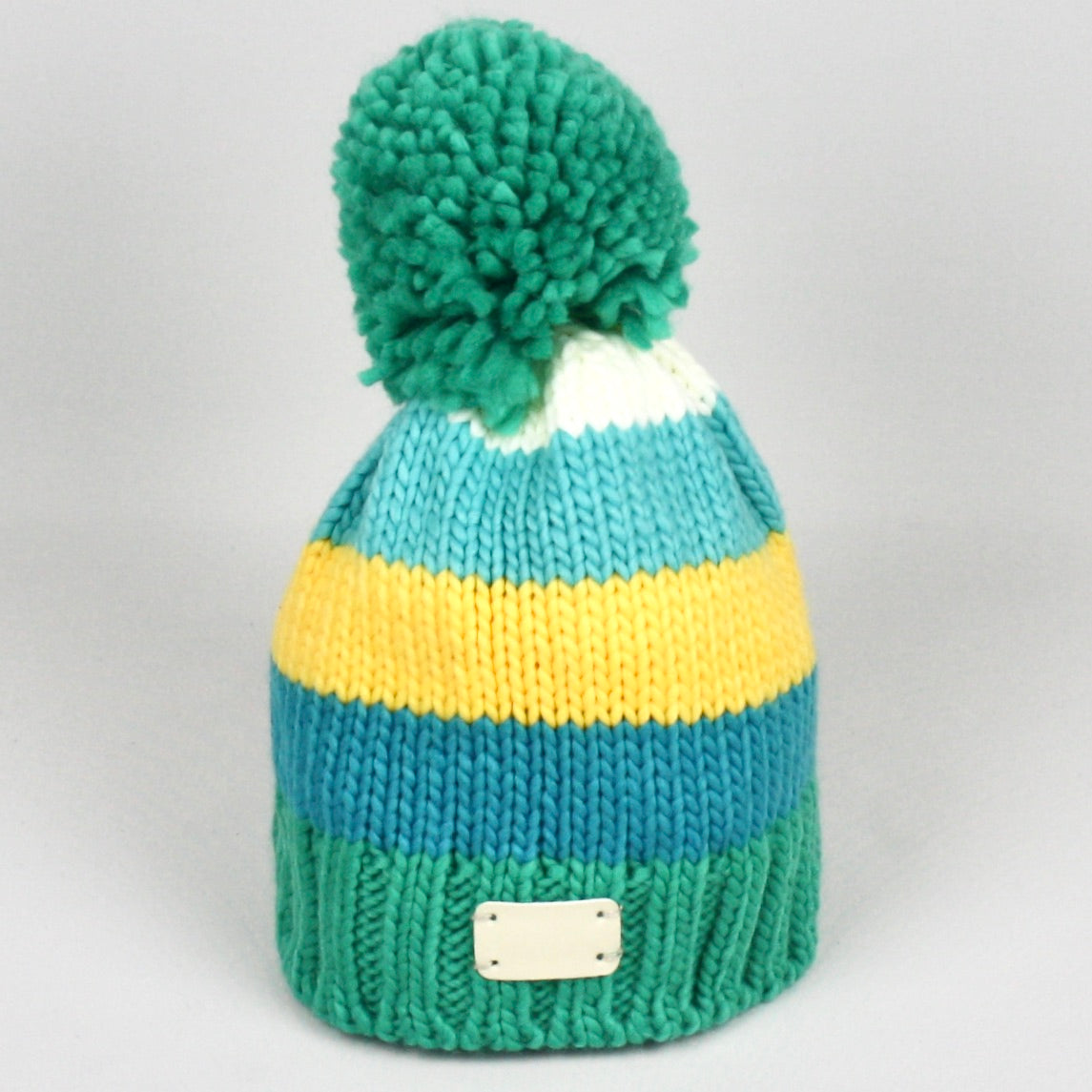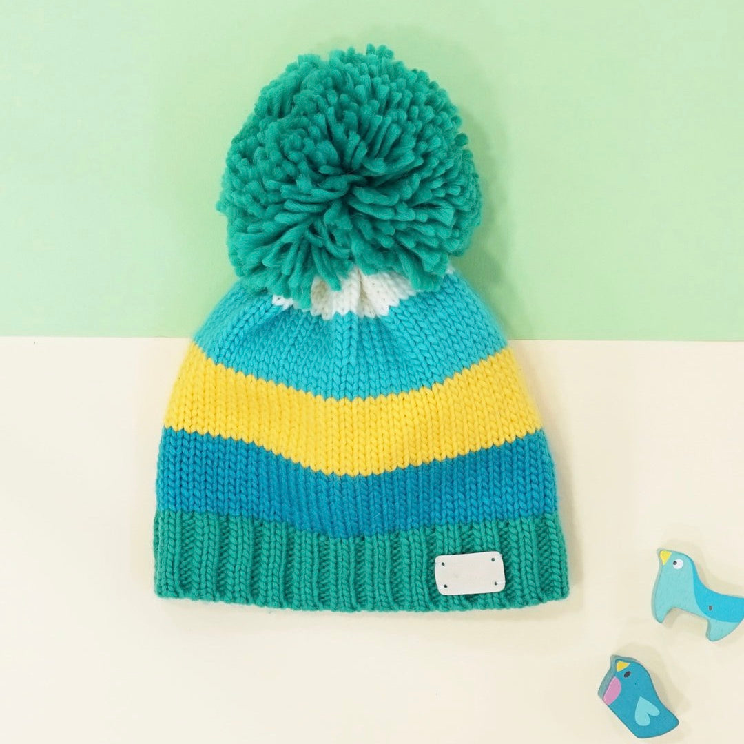 In this gorgeous mix of green, blue and mustard this bobble hat is something different and sure to make you smile.