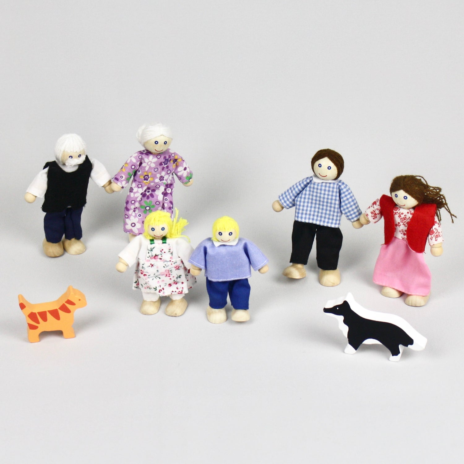 Here are three generations of one loving wooden family - grandparents, mum, dad, their two children and their pets - a cat and a dog.