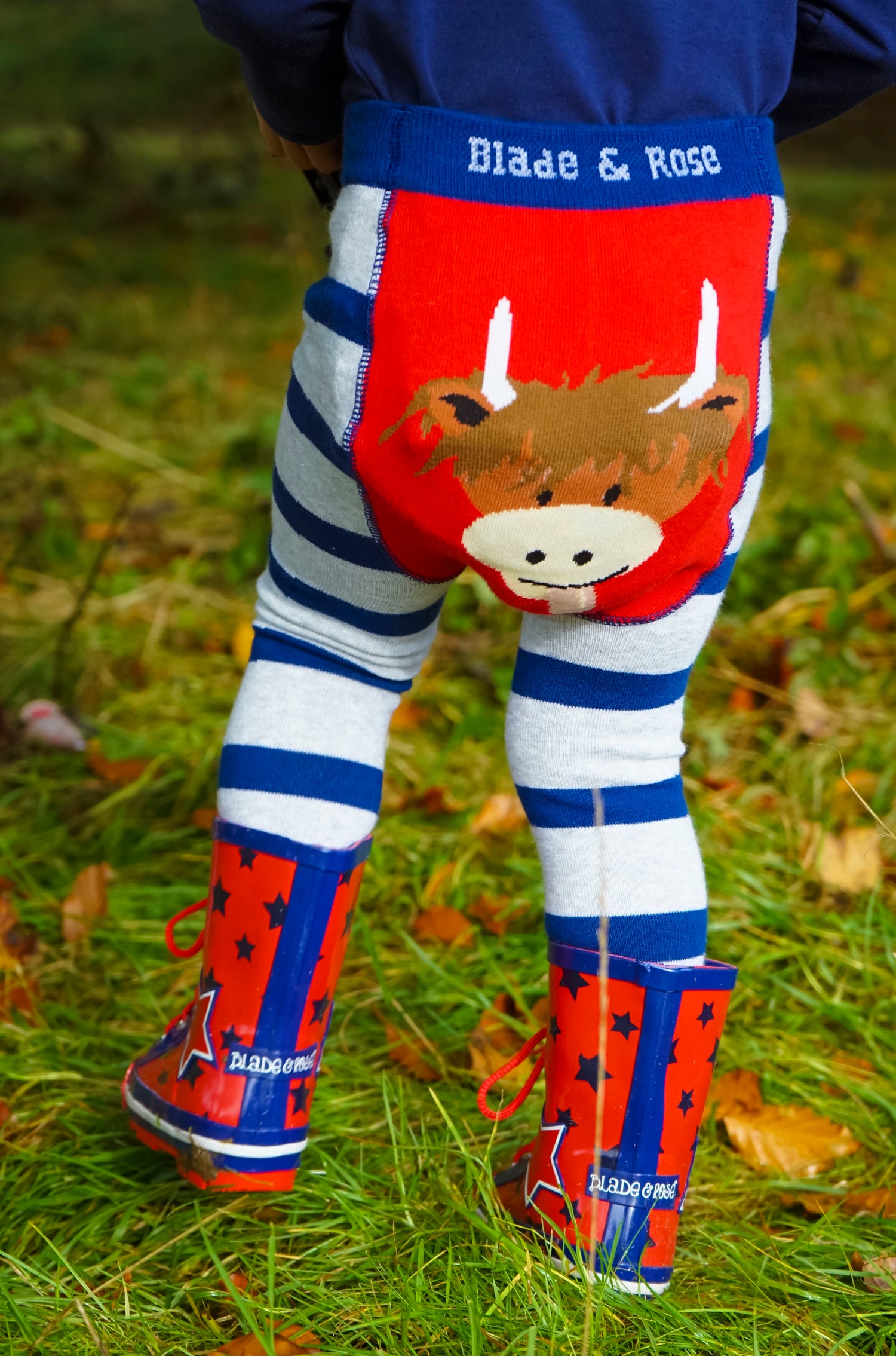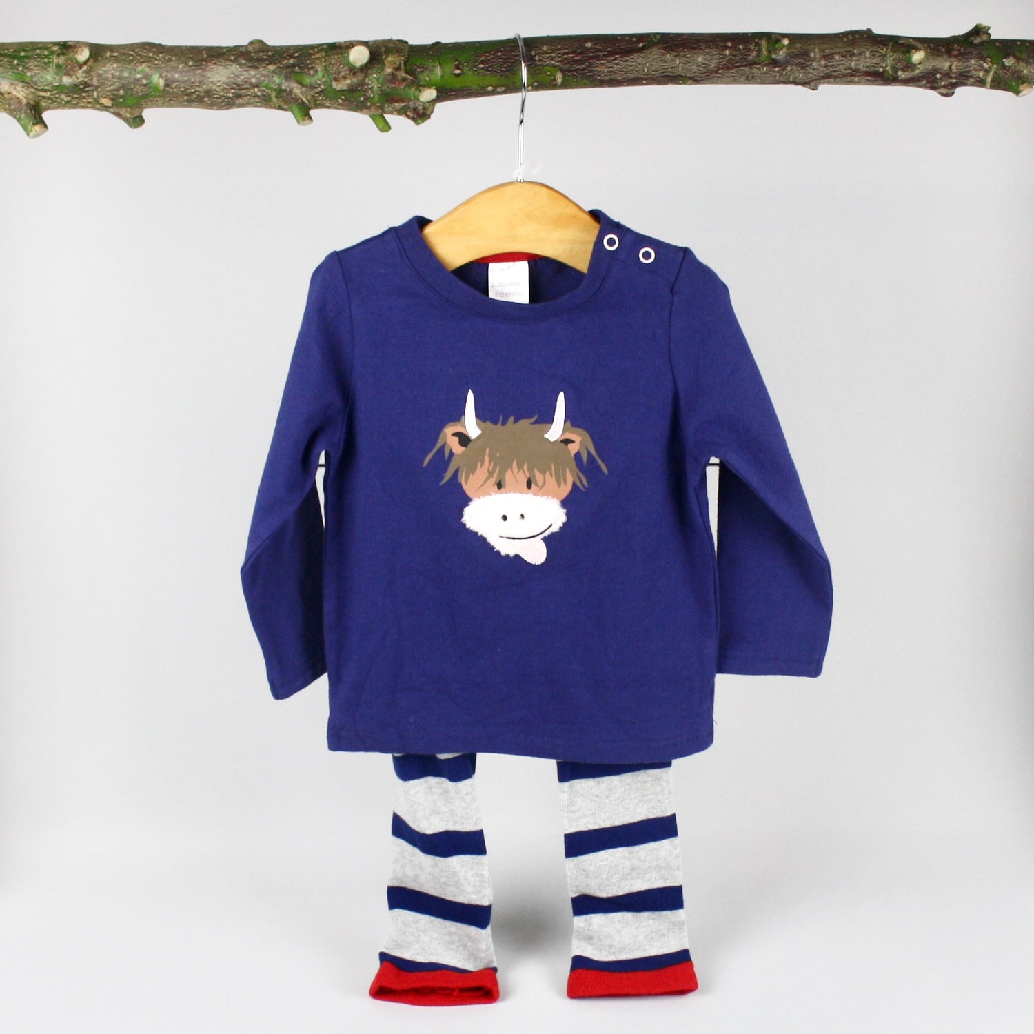 We adore this highland cow top and leggings. The top is blue and features a soft fleece applique highland cow. The leggings are in grey, blue and red, featuring a highland cow on the bum which is ready to wander and discover.