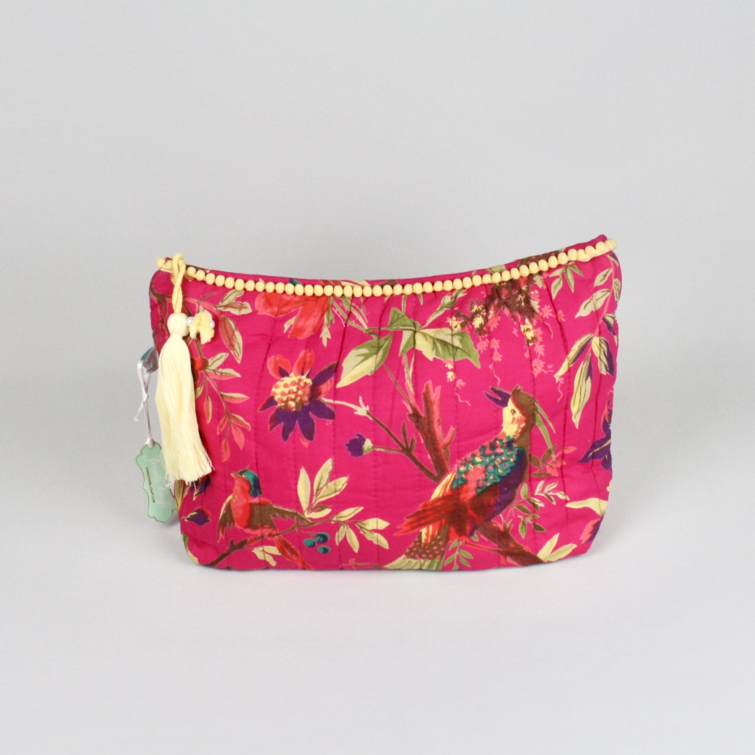This generously sized bag has a silky lining, a zipped internal pocket, and decorative piping. The zip pulls with a pom-pom and pearl trimmed tassel and there is a soft lemon pom-pom trim along the top. This vibrant Chinoiserie-inspired print features multi-coloured birds sitting on branches laden with exotic flowers against a hot pink background.