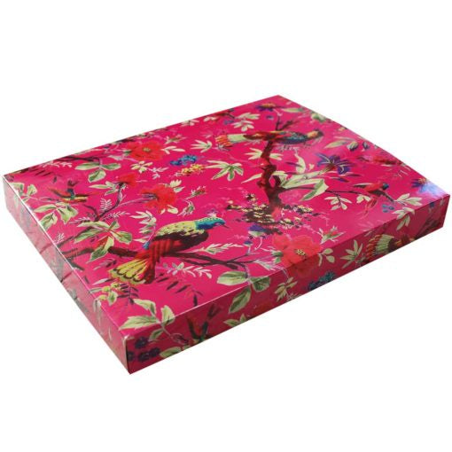 This vibrant chinoiserie-inspired print features exotic birds sitting on branches laden with exotic flowers in red, yellow purple against a striking hot pink background.