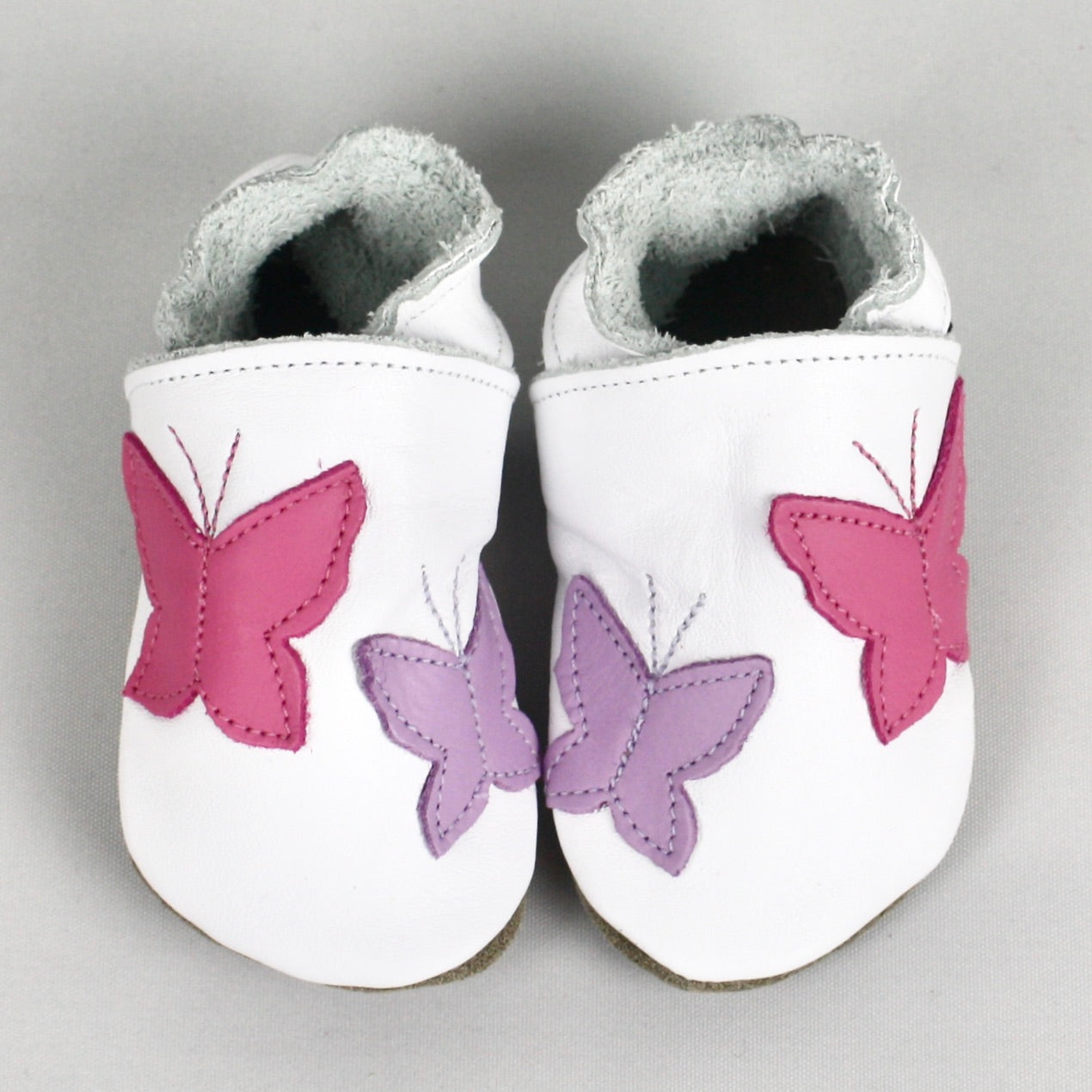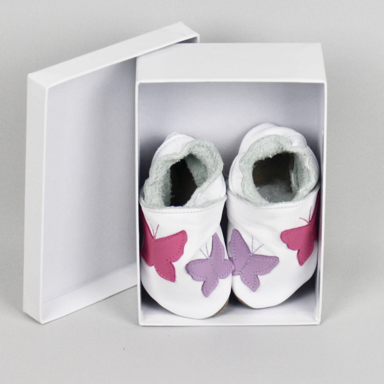 These gorgeous butterfly inspired baby shoes in white / lilac & pink make the perfect gift for a baby.