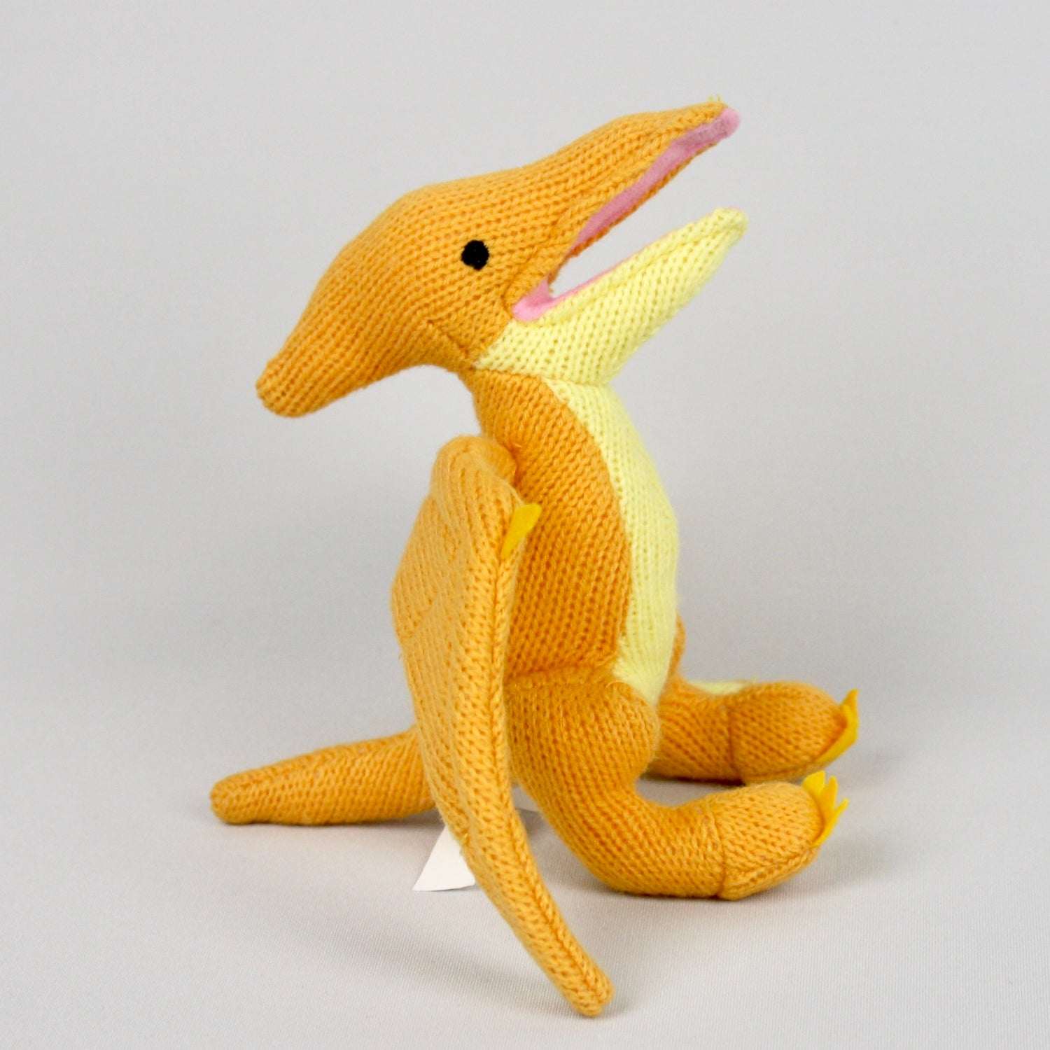 This small mustard yellow pterodactyl knitted dinosaur rattle is ideal for babies and toddlers.