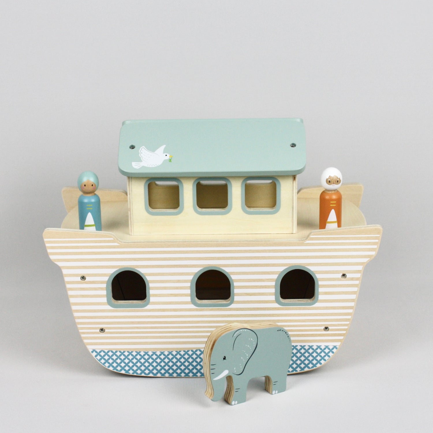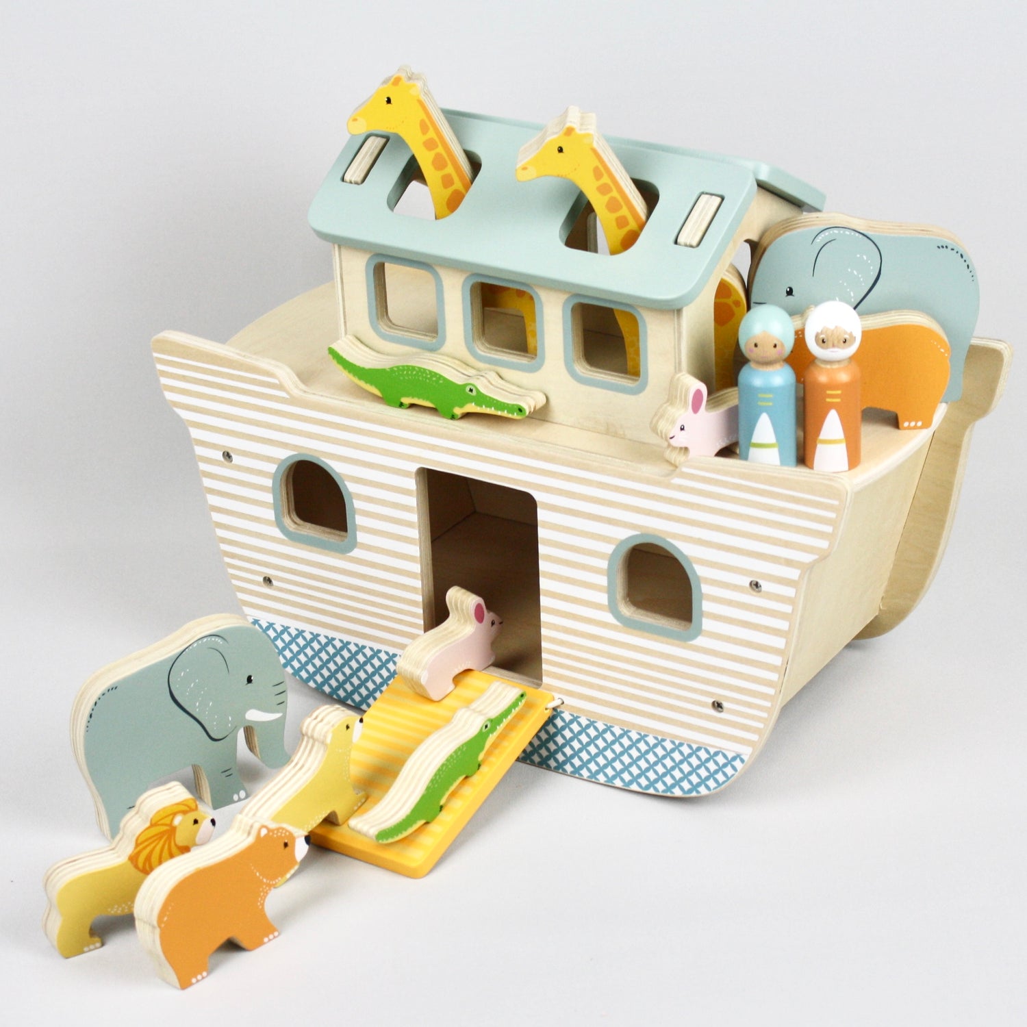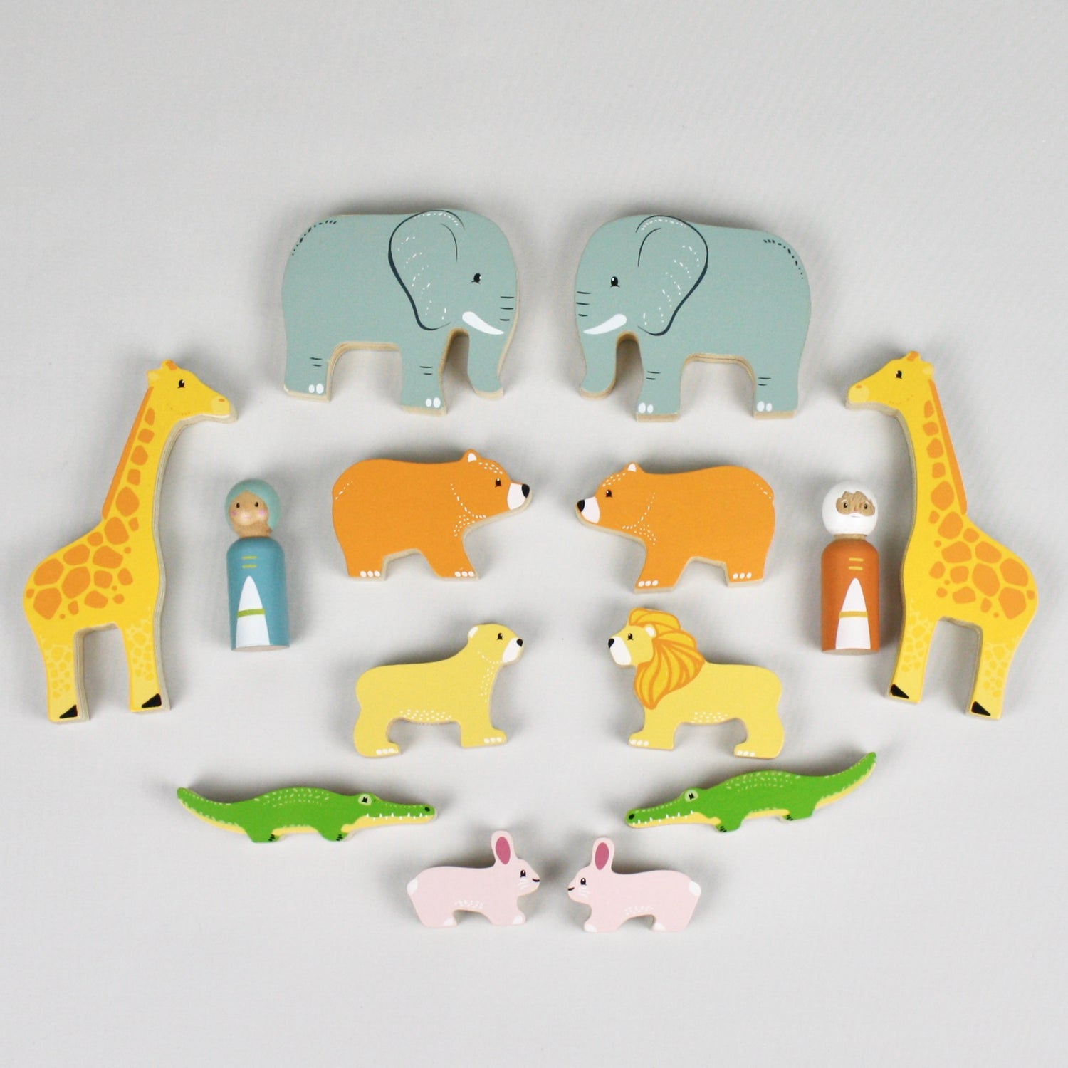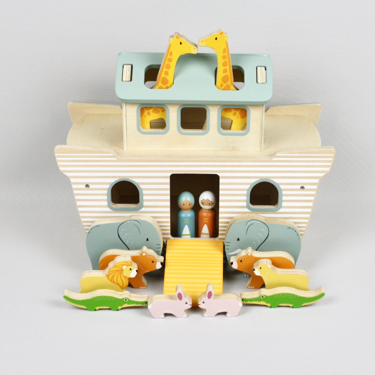 Includes: Noah and his wife, 2 bears, 2 elephants, 2 crocodiles, 2 rabbits, 2 lions and 2 giraffes.