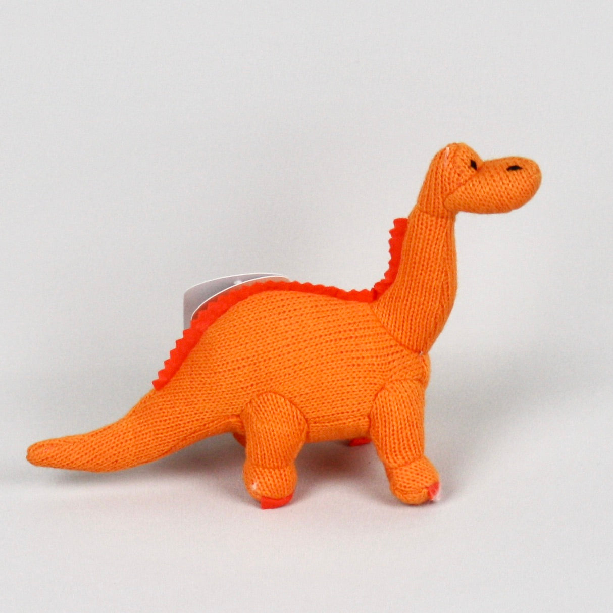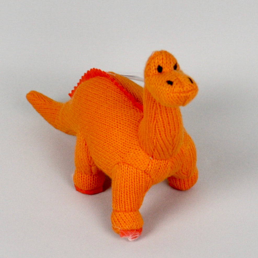 This small orange diplodocus knitted dinosaur rattle is ideal for babies and toddlers.