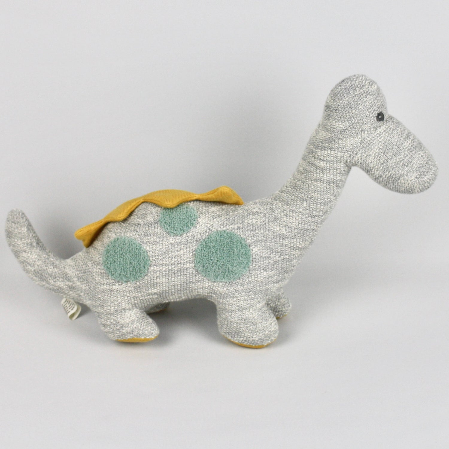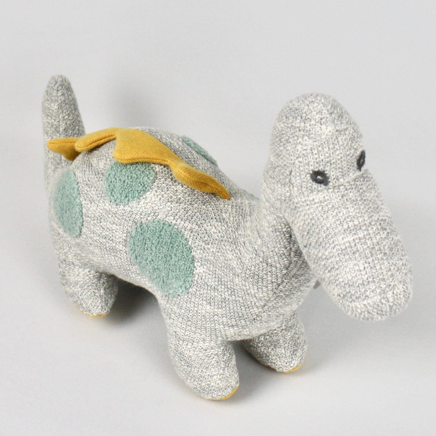 This large Diplodocus toy is made from tactile organic cotton in a gorgeous scheme of soft grey with raised teal spots and mustard spikes.