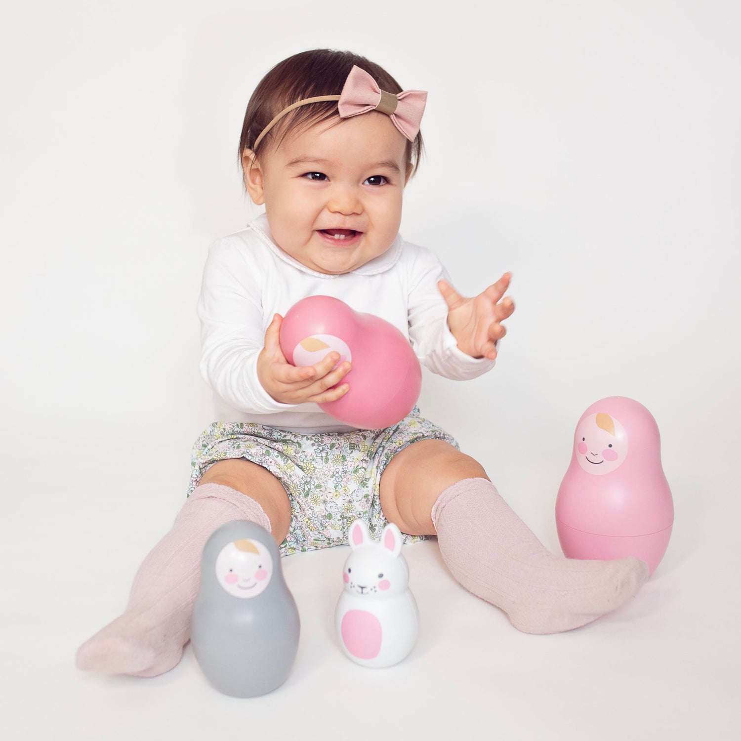 Playtime is precious time and the gorgeous pastel pink coloured Nesting Babies make a wonderful and charming addition to the nursery. Parents can demonstrate how the toy works, and watch baby’s excitement as the babies are revealed one by one. Then there’s the final sensory surprise of a chiming Bo Bunny in the centre!