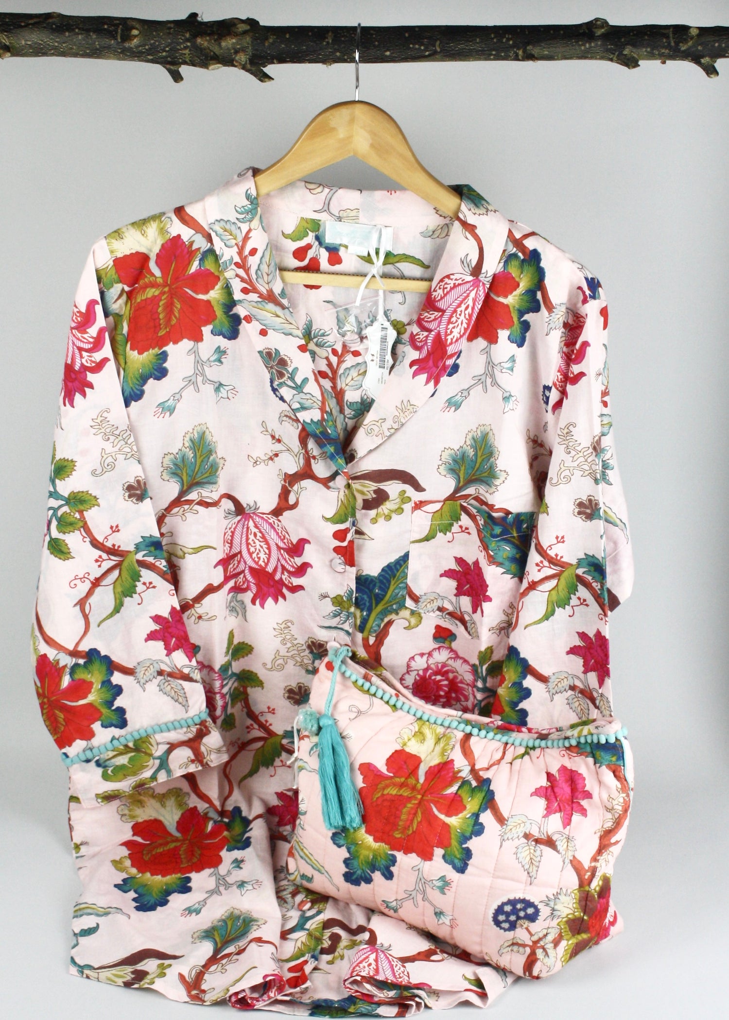 This gorgeous nightshirt has a pale pink background and is printed with large stylised exotic flowers in the tradition of Chinoiserie which introduces bright pops of colour and overall makes for a stunning gift.