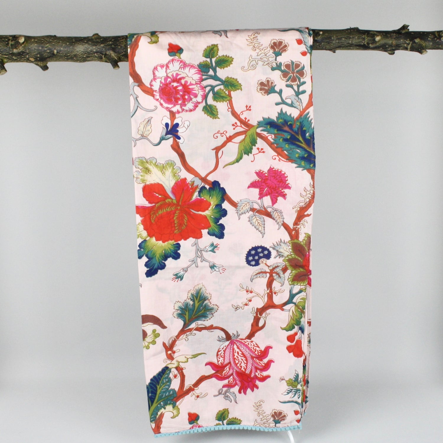 Scarves are an essential fashion accessory; they transform an outfit instantly by introducing colour and print. Perfect all year round with a colourway for everyone, this design feature flowers, leaves and birds and are expertly printed in India. The scarves are 100% cotton with pom-pom trimmed ends and are luxuriously long – 180 x 50cm, long enough to drape and tie in lots of different stylish ways.