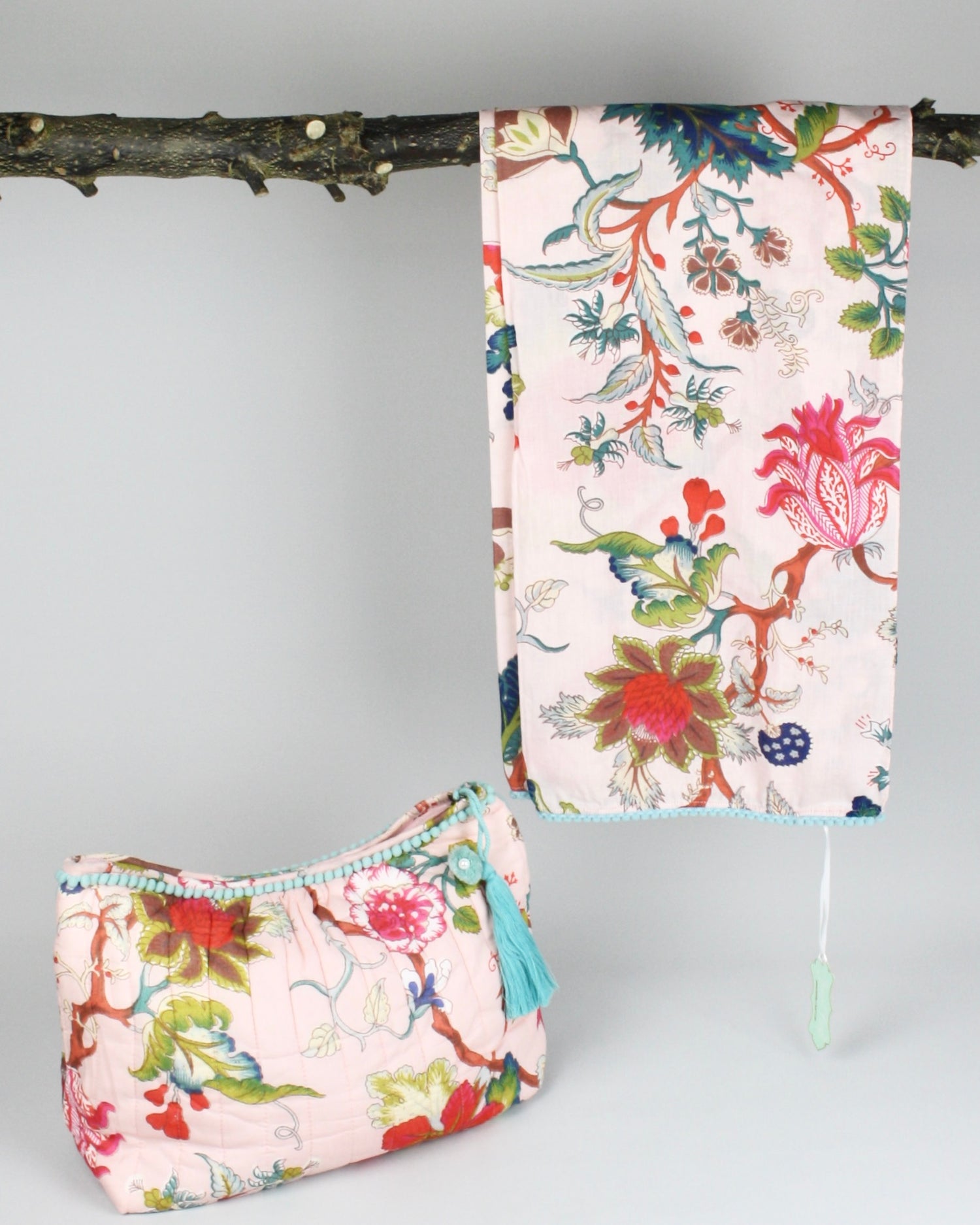 Keep all your toiletries together in this beautiful pink exotic flower styled quilted cotton wash bag.