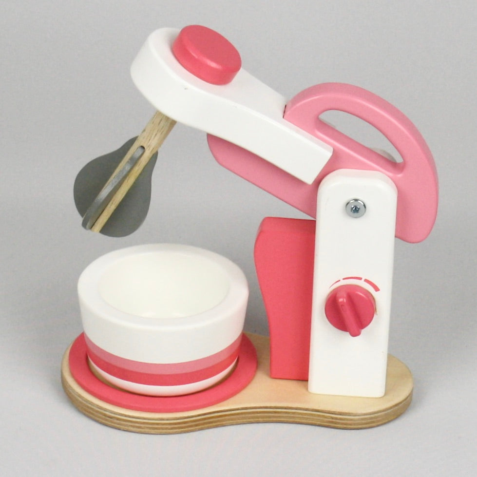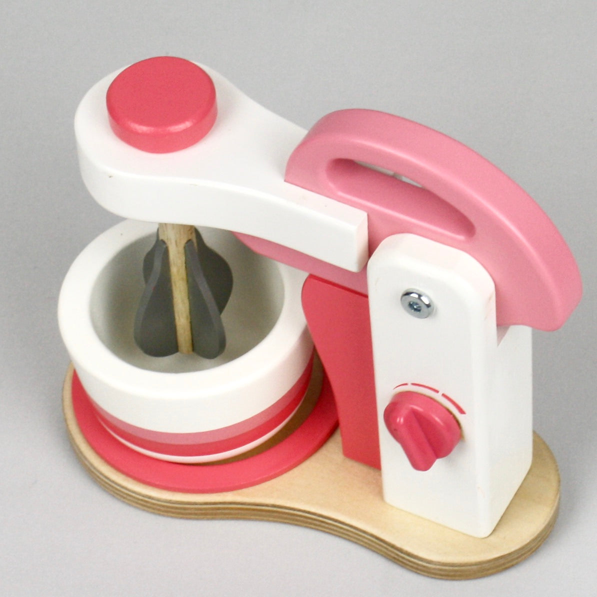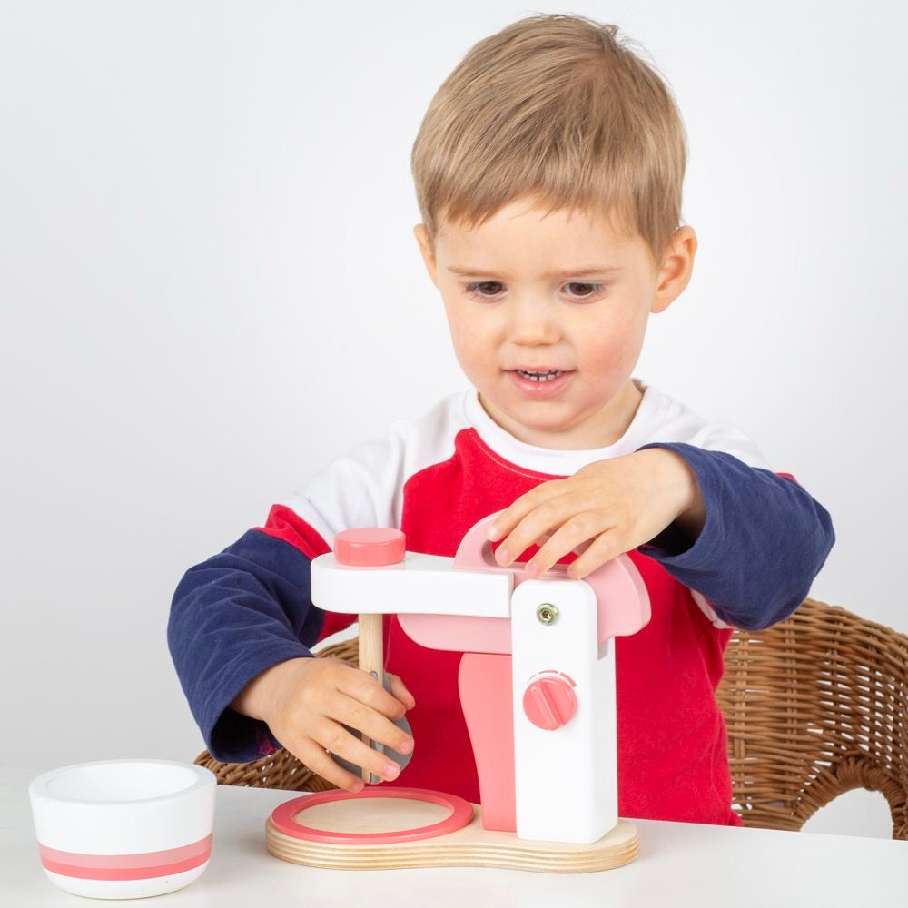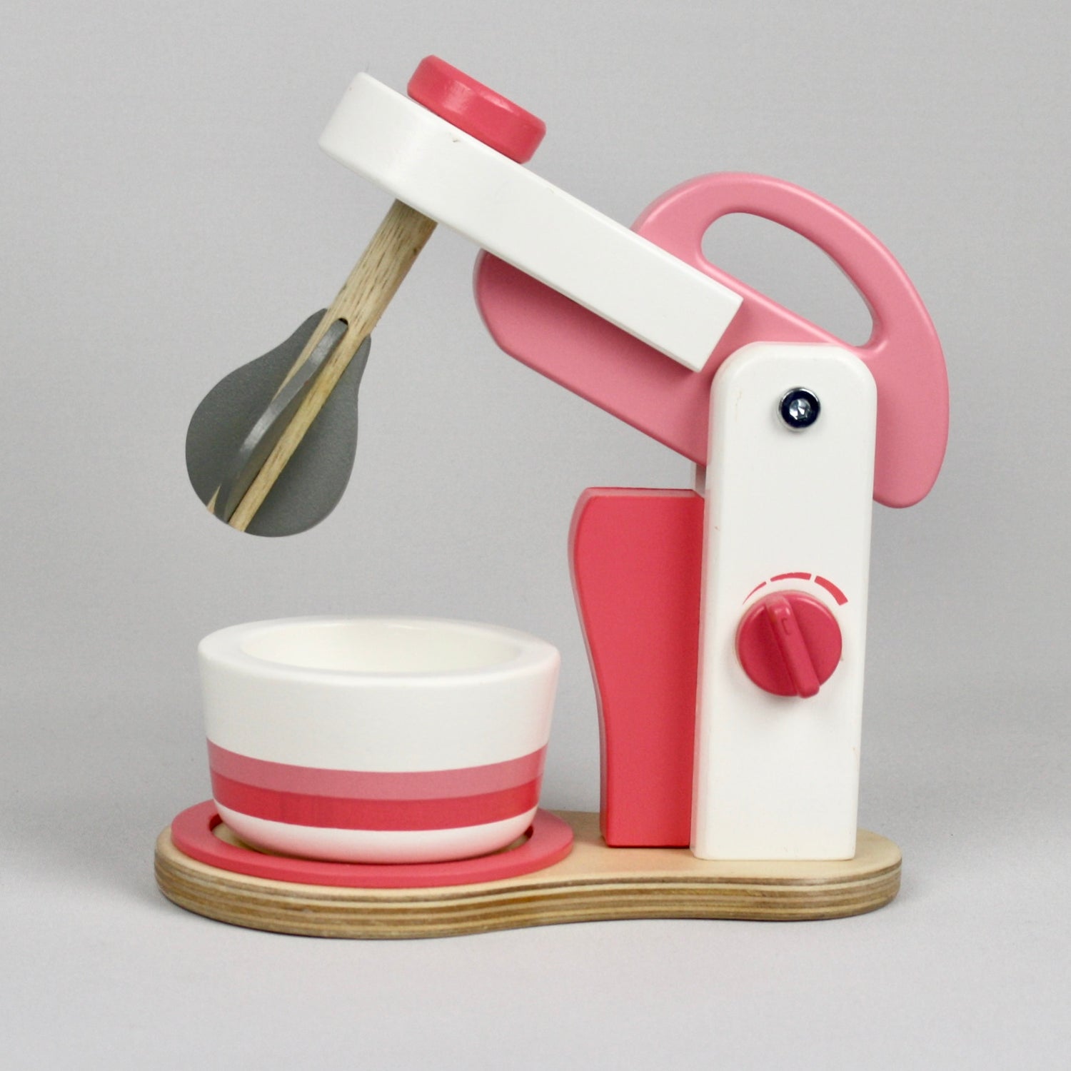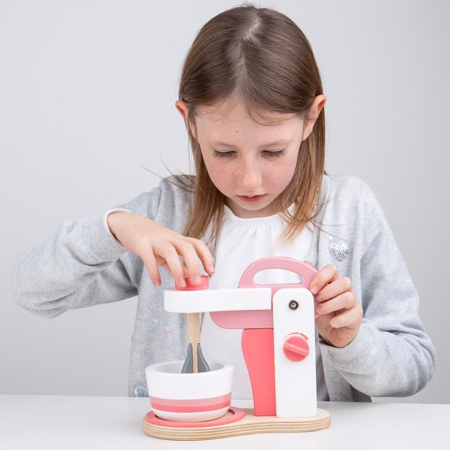 Mix up some delicious pretend play fun with this realistic wooden Pink Food Mixer that has a whole load of interactive features!