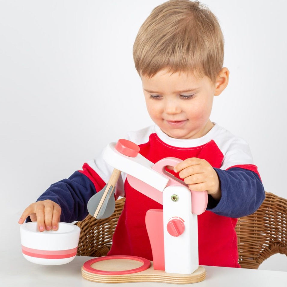 There is an on/off dial, a liftable mixer that actually rotates and a bowl awaiting ingredients! Plus, the on/off dial makes a realistic clicking noise. With its quality wooden construction this set is an essential play kitchen accessory, sure to provide years of pretend play fun.