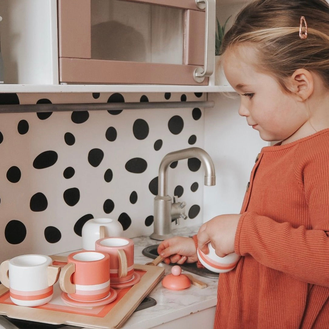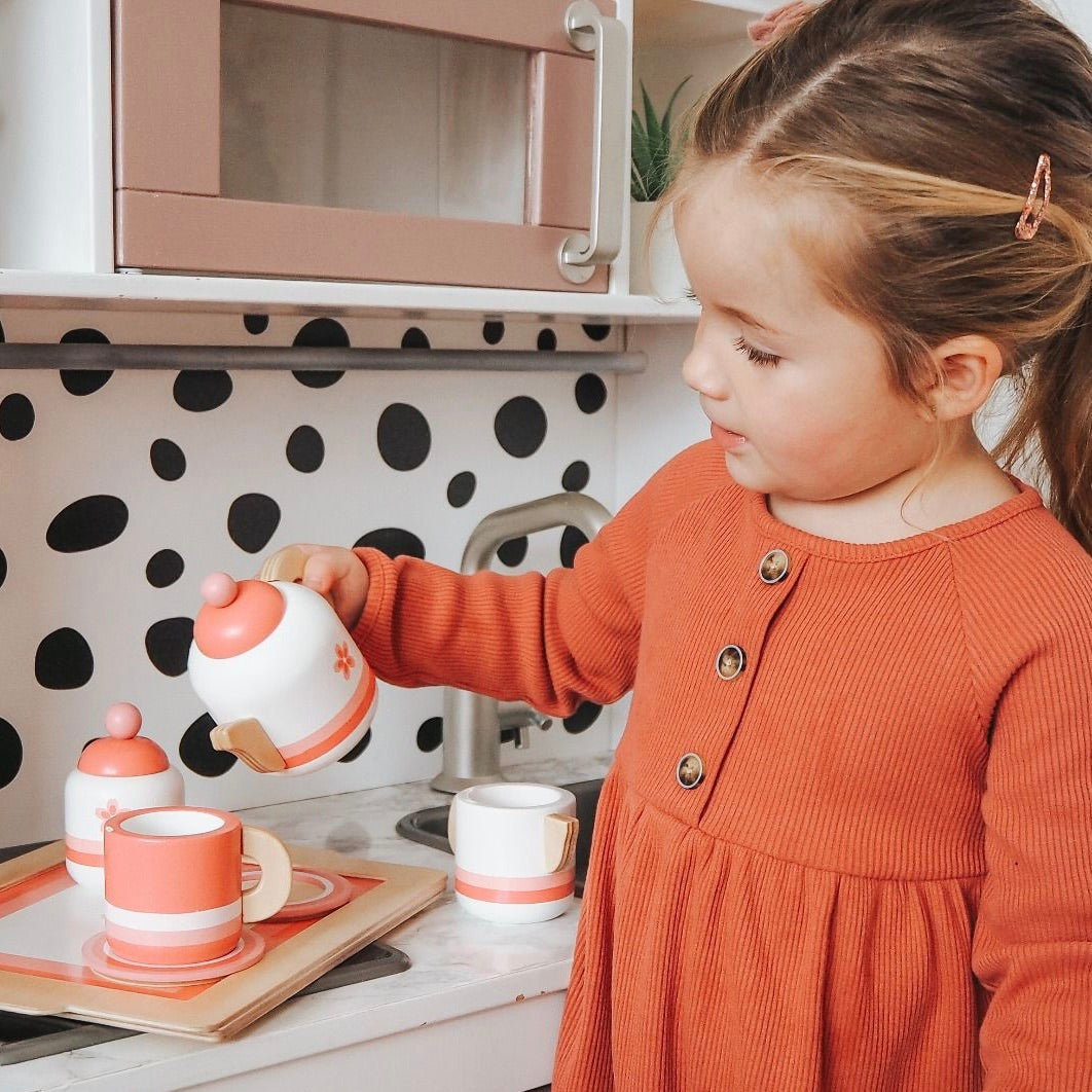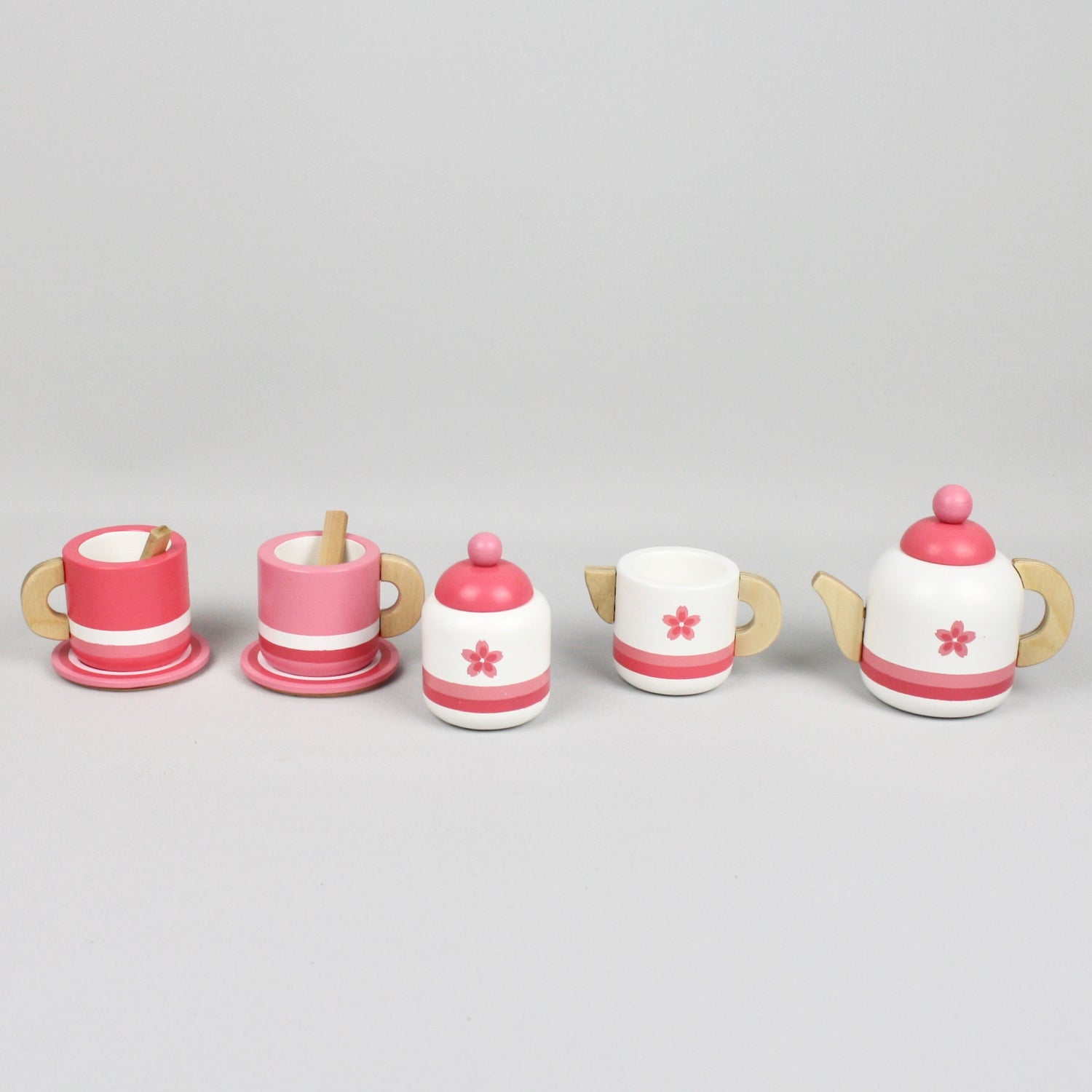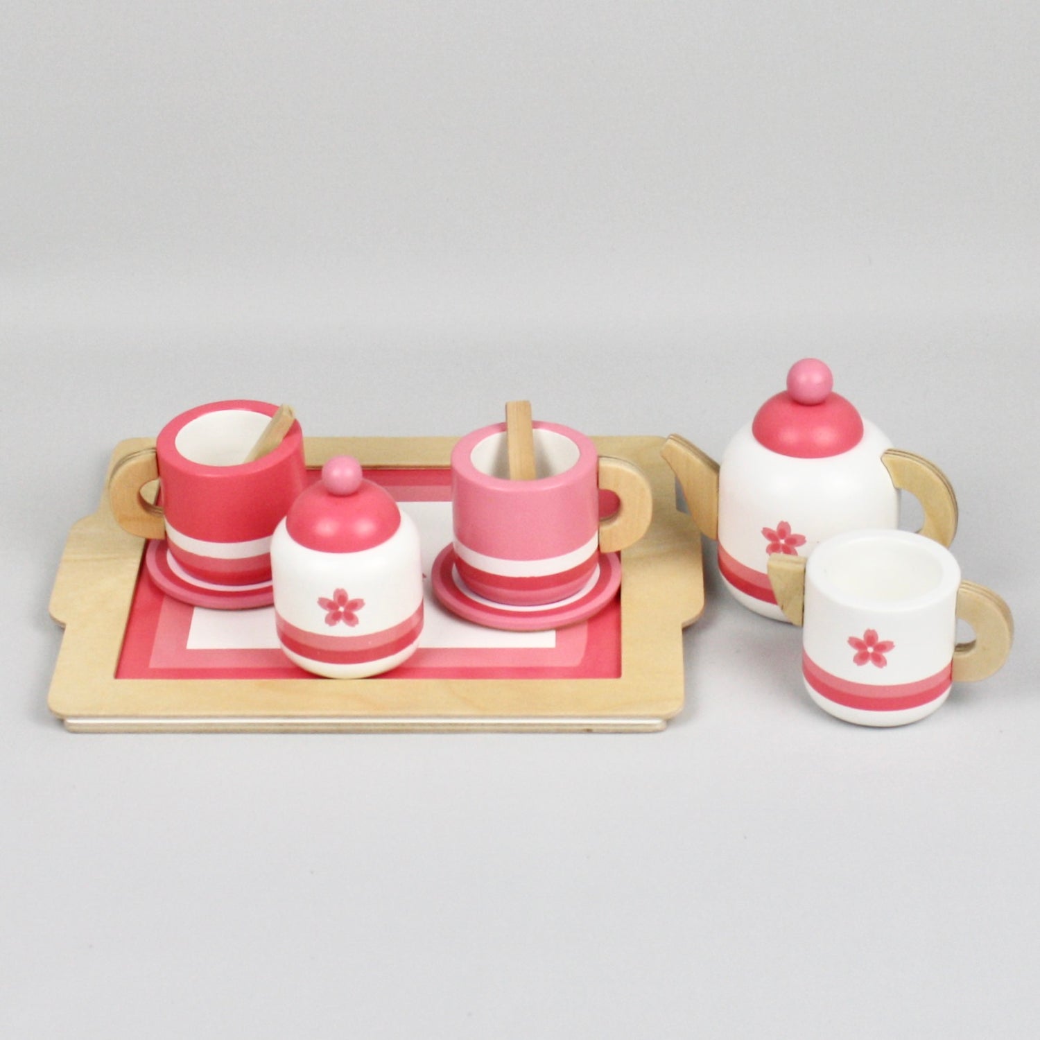 Little ones can put their hosting skills to work with the Toy wooden Pink Tea Set and Tray.