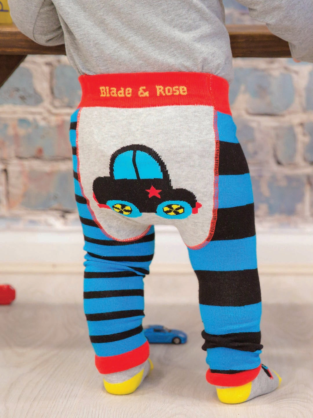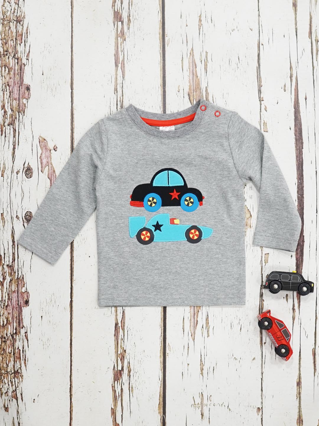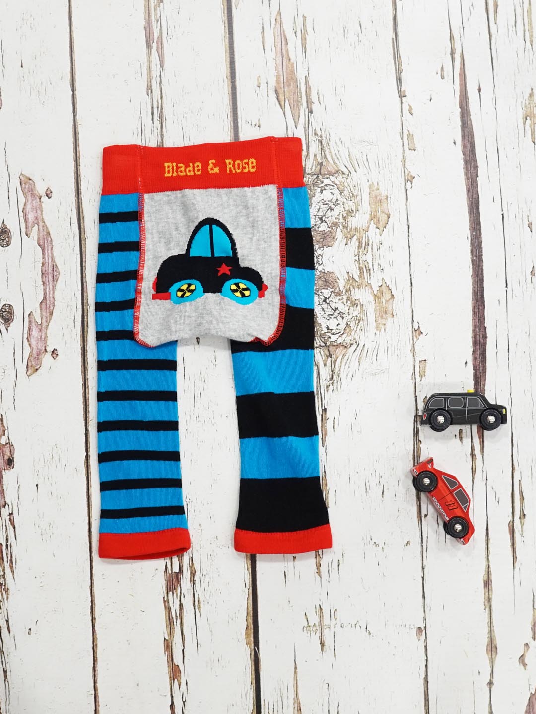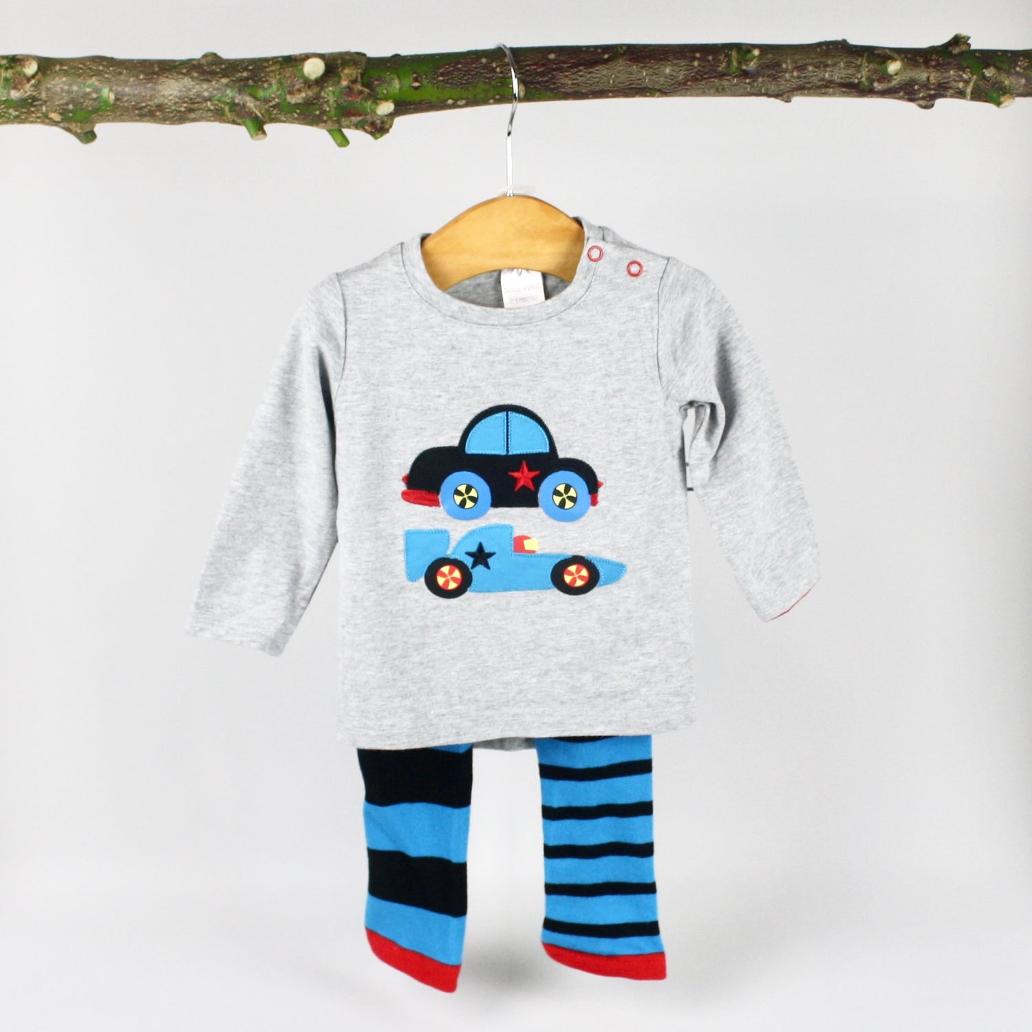We adore this roaring racing car top and leggings. The top is grey and features two soft fleece applique racing cars. The leggings are in blue and black contrasting stripes, featuring a car on the bum which is ready to speed away and play.