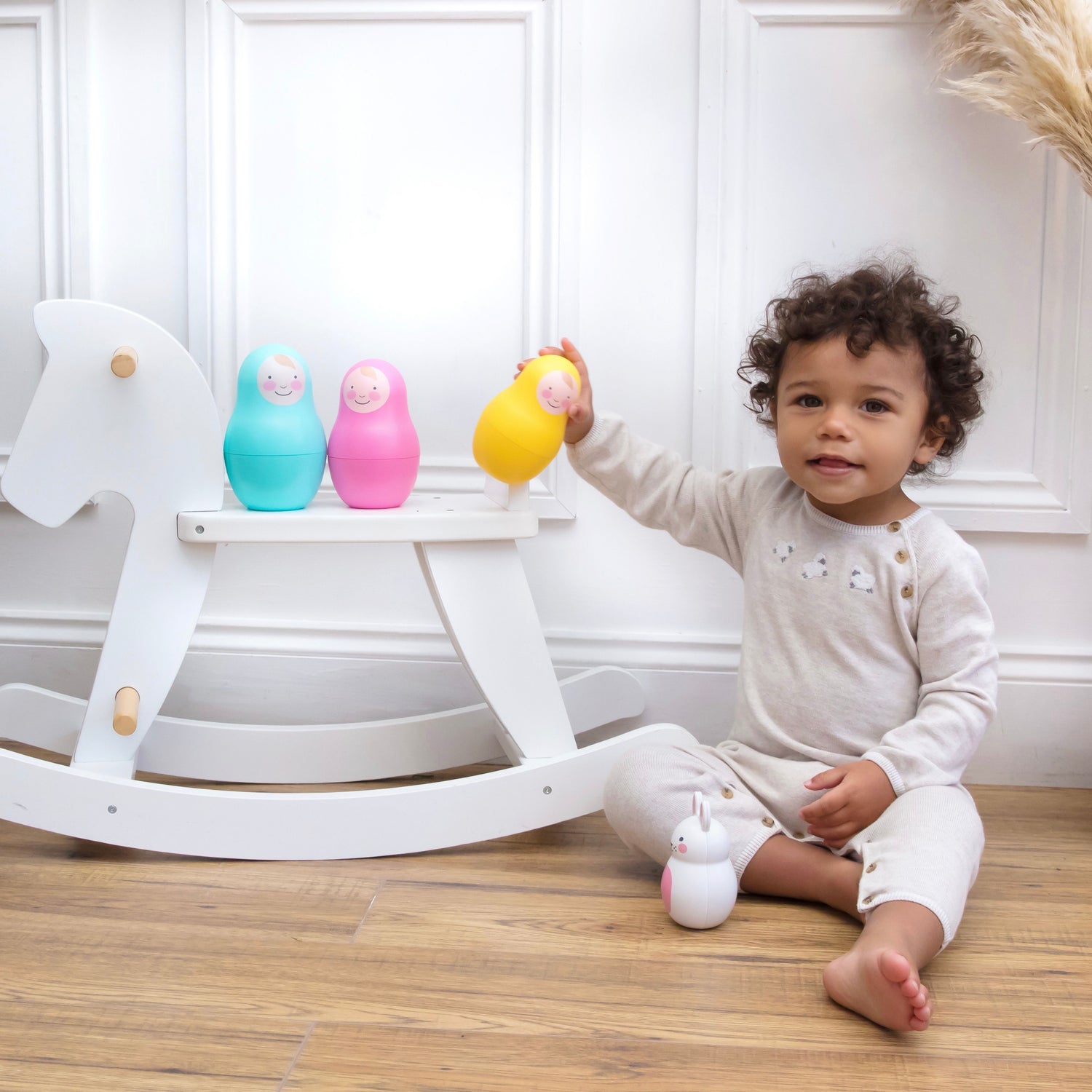Playtime is precious time and the rainbow theme brightly coloured Nesting Babies make a wonderful and charming addition to the nursery. Parents can demonstrate how the toy works, and watch baby’s excitement as the babies are revealed one by one. Then there’s the final sensory surprise of a chiming Bo Bunny in the centre!