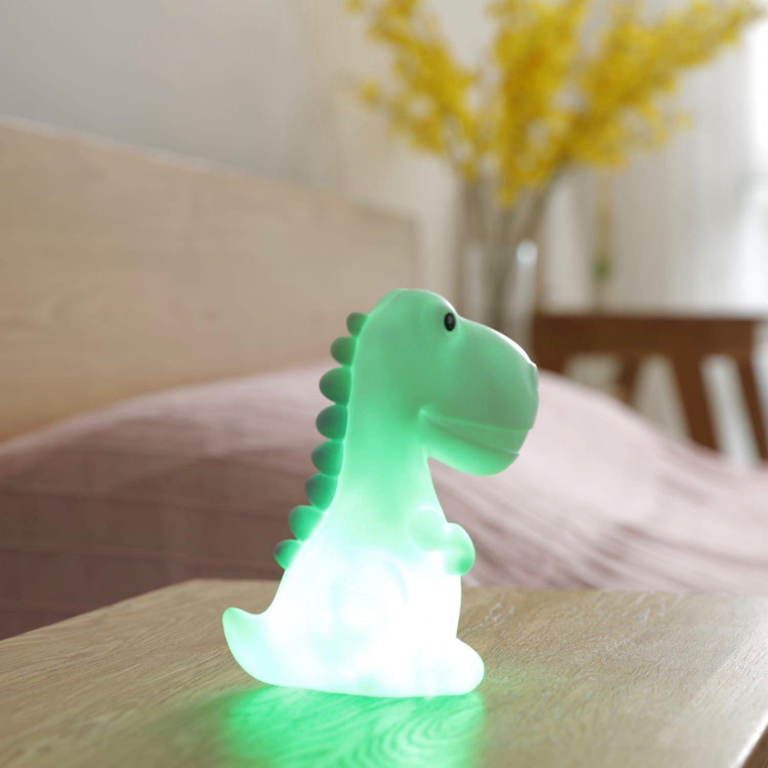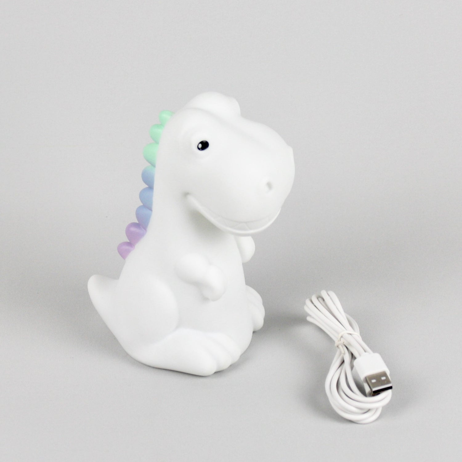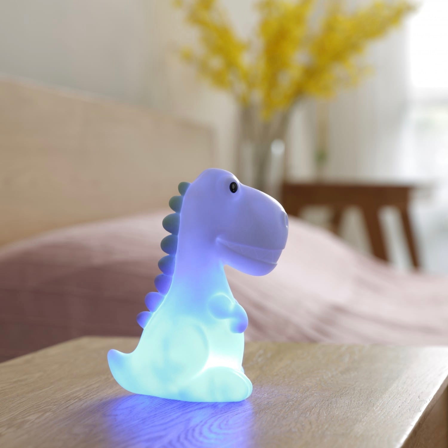 - 3 different options of light by simply tapping the dinosaur are: 50% softer white light, 100% brighter white light or multi-coloured auto changing