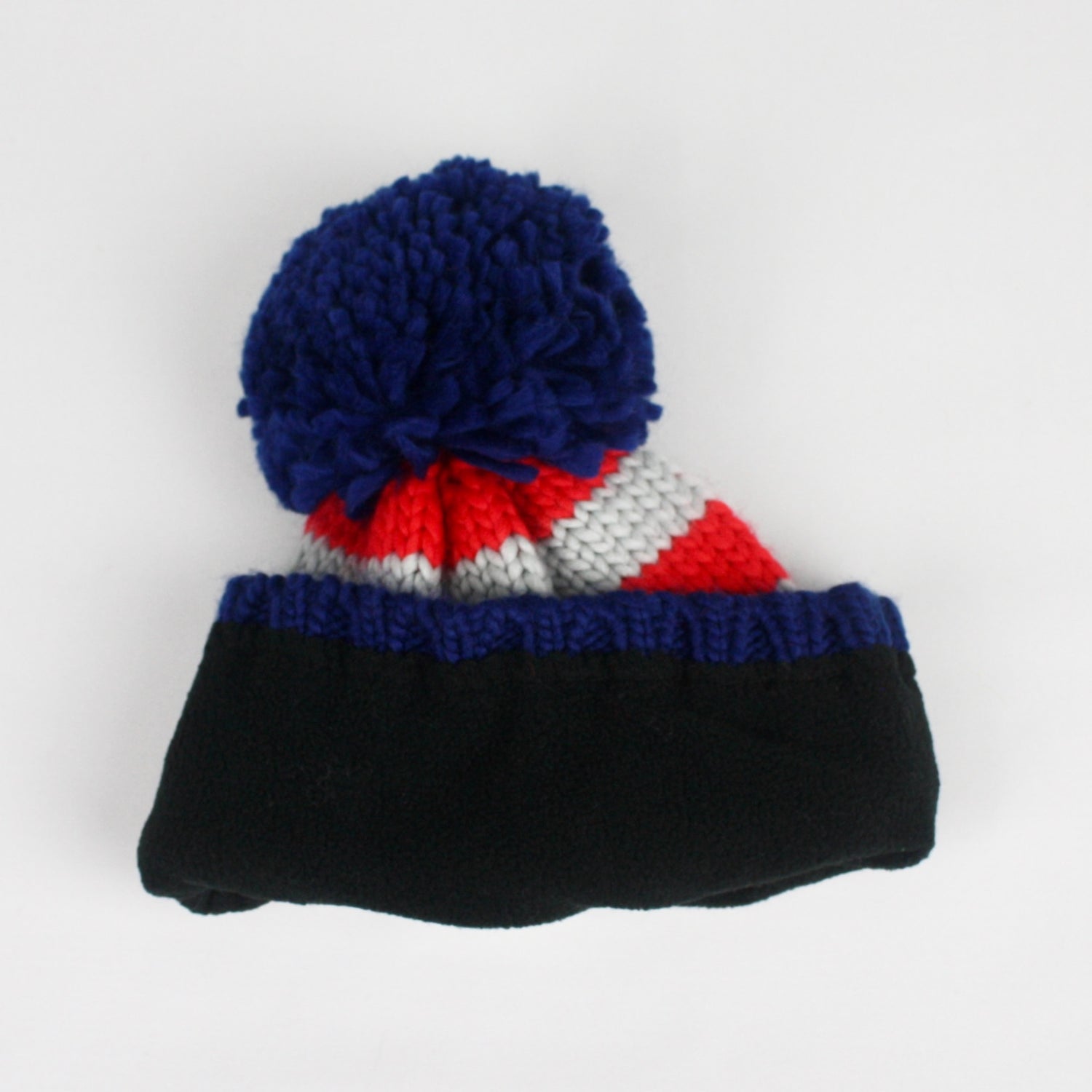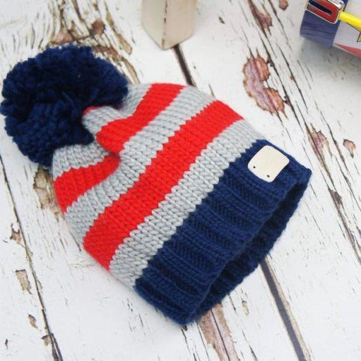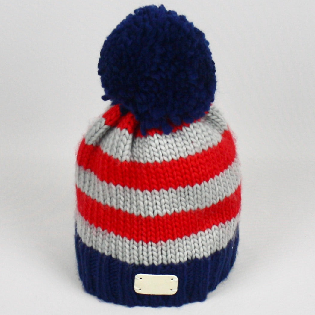 In this gorgeous mix of navy, red and grey this bobble hat is something different and sure to make you smile.