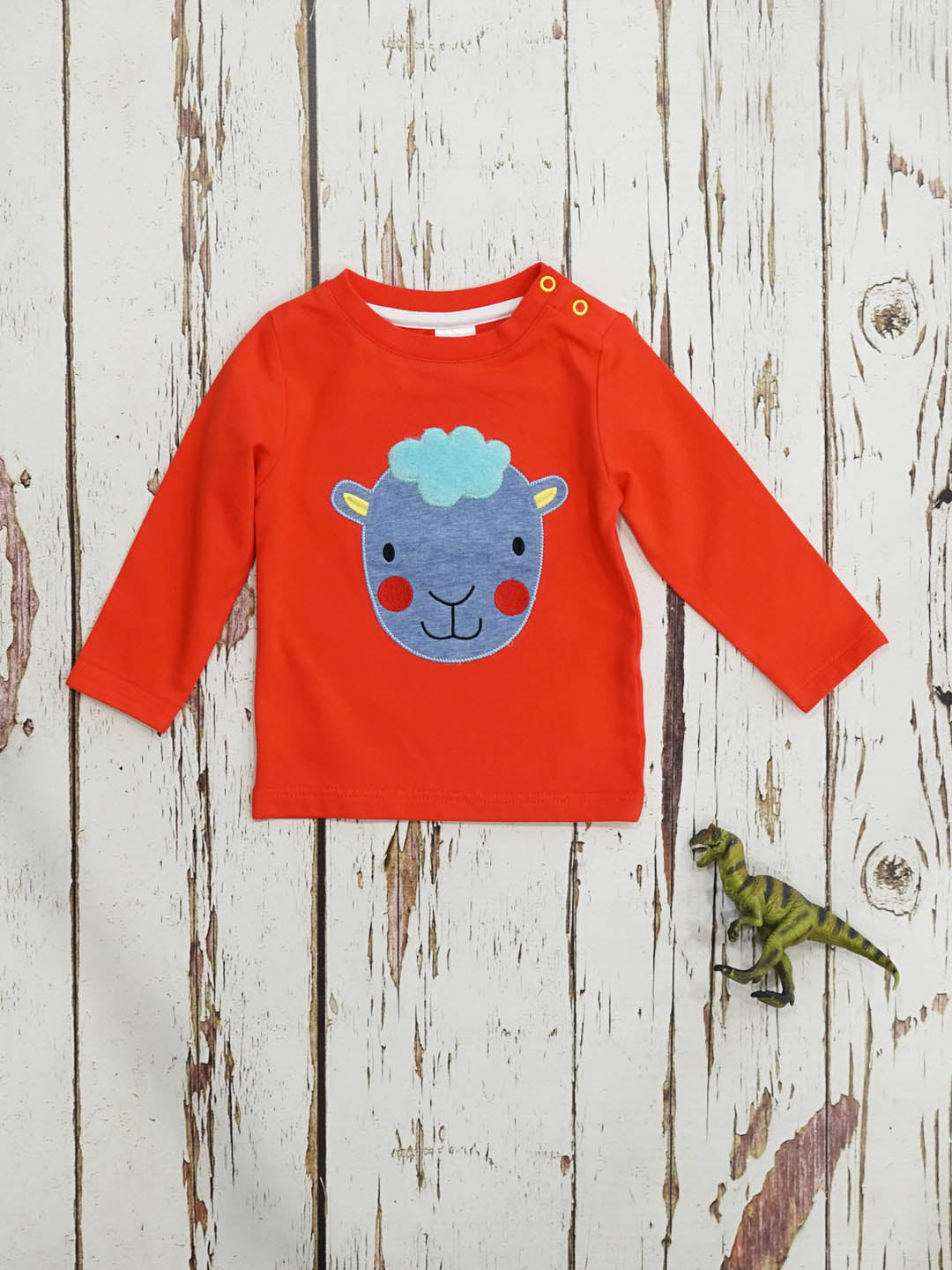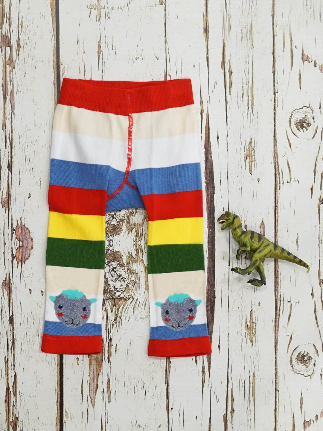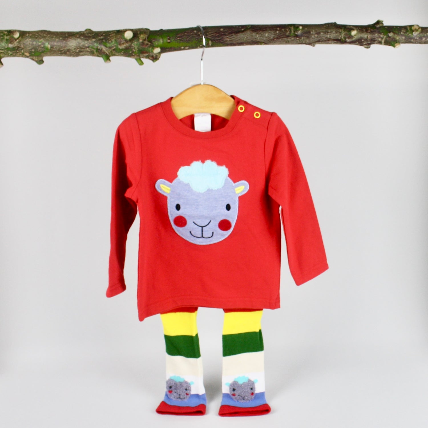 We adore this brilliant bright sheep top and leggings. The top is red and features a soft fleece applique sheep. The leggings are in a stunning combination of cream, green, yellow, red, white and blue, featuring a sheep on the bum which is ready to wander and discover.