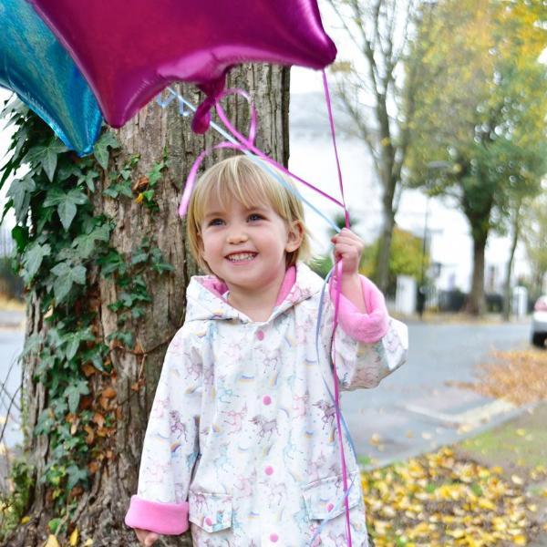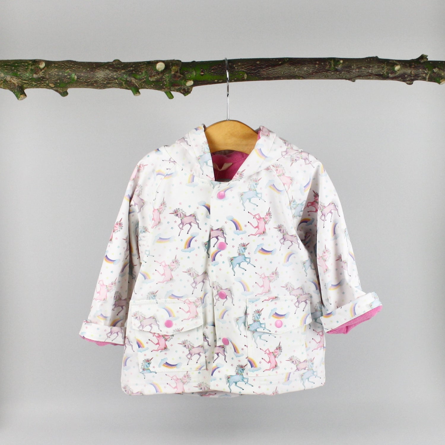This pretty raincoat has a magical print featuring unicorns, rainbows, and stars in lovely pastel tones which are complimented by the white background.