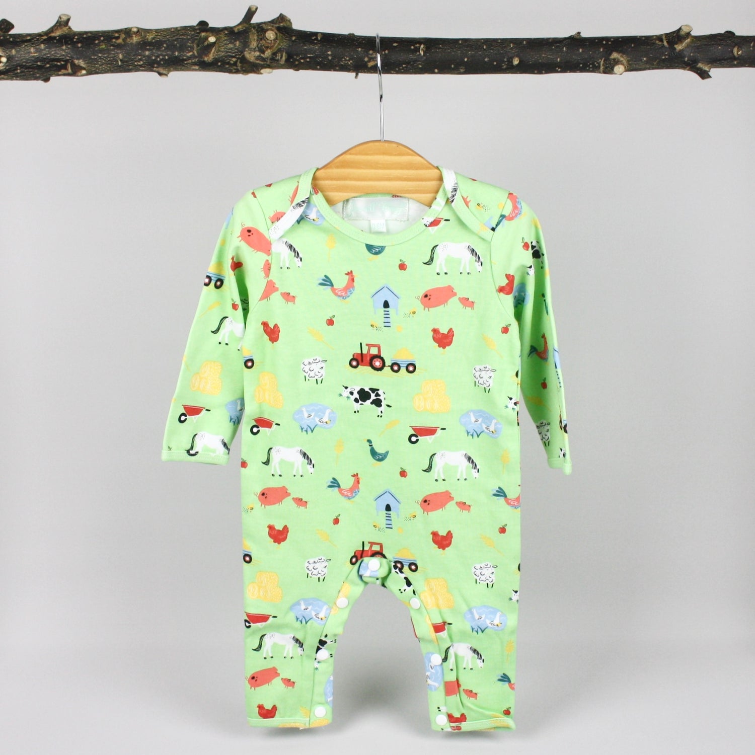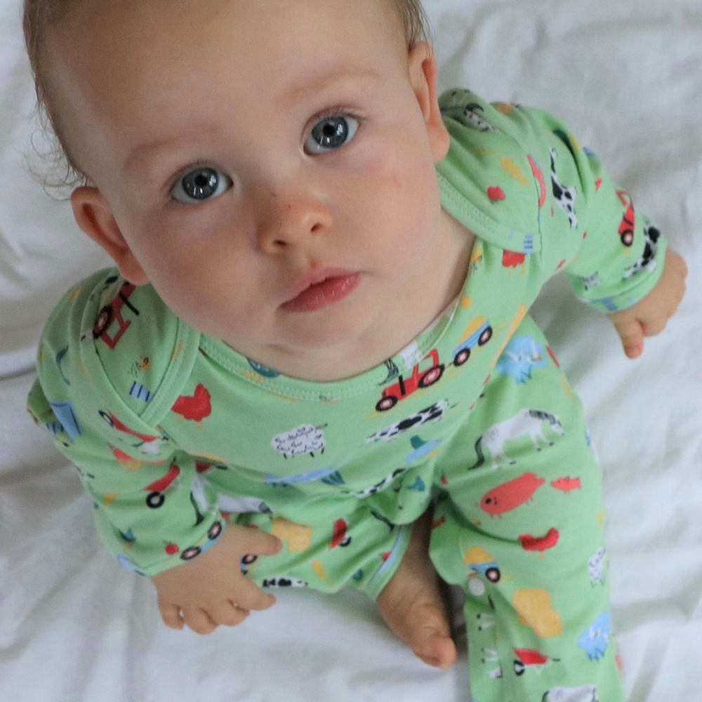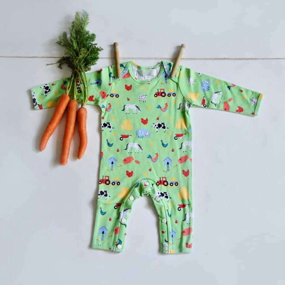 The print looks straight out of a story book with its green background and busy farmyard scene with colourful animals, tractors, hay bales, and hen houses. Perfect new baby gift!