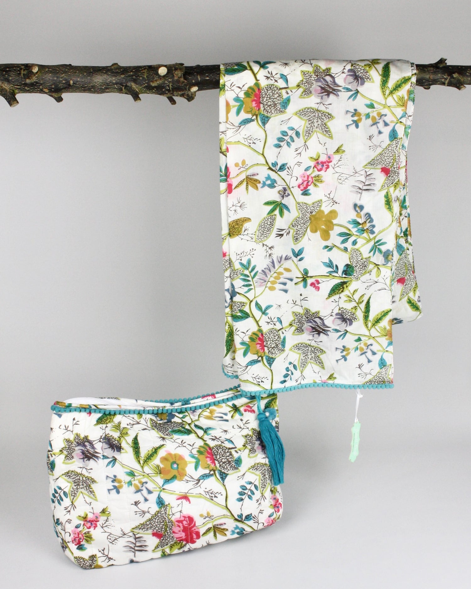 Scarves are an essential fashion accessory; they transform an outfit instantly by introducing colour and print. Perfect all year round with a colourway for everyone, this design feature flowers, leaves and birds and are expertly printed in India. The scarves are 100% cotton with pom-pom trimmed ends and are luxuriously long – 180 x 50cm, long enough to drape and tie in lots of different stylish ways.